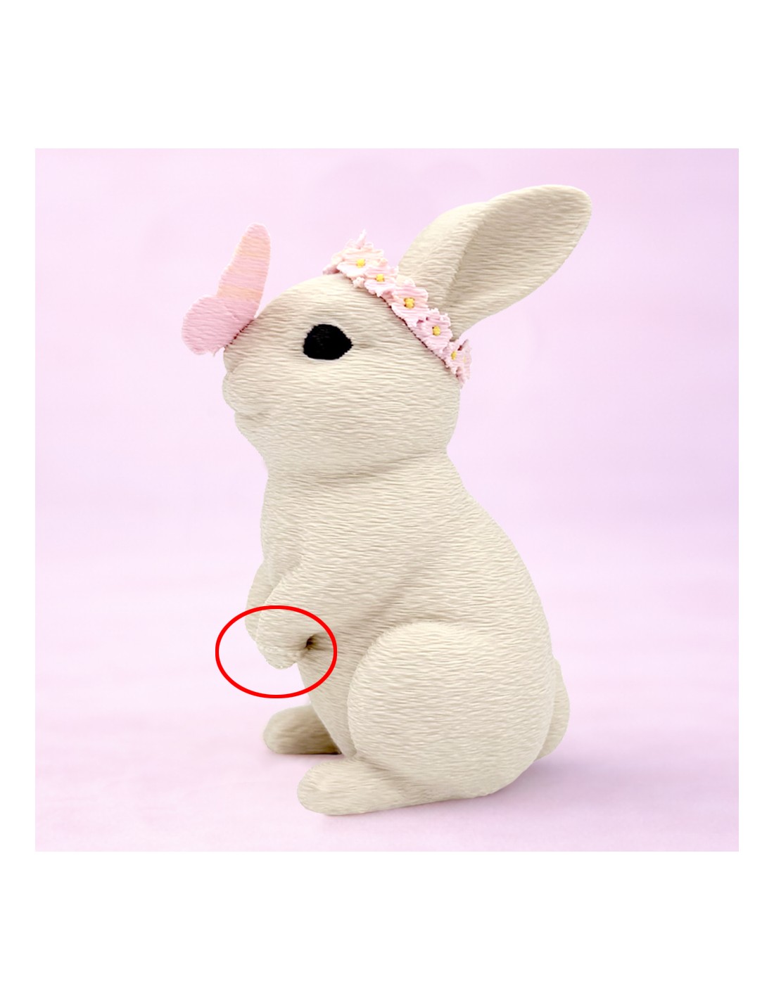 Kleur: Beige konijntje met roze vlinder en bloemenkrans.