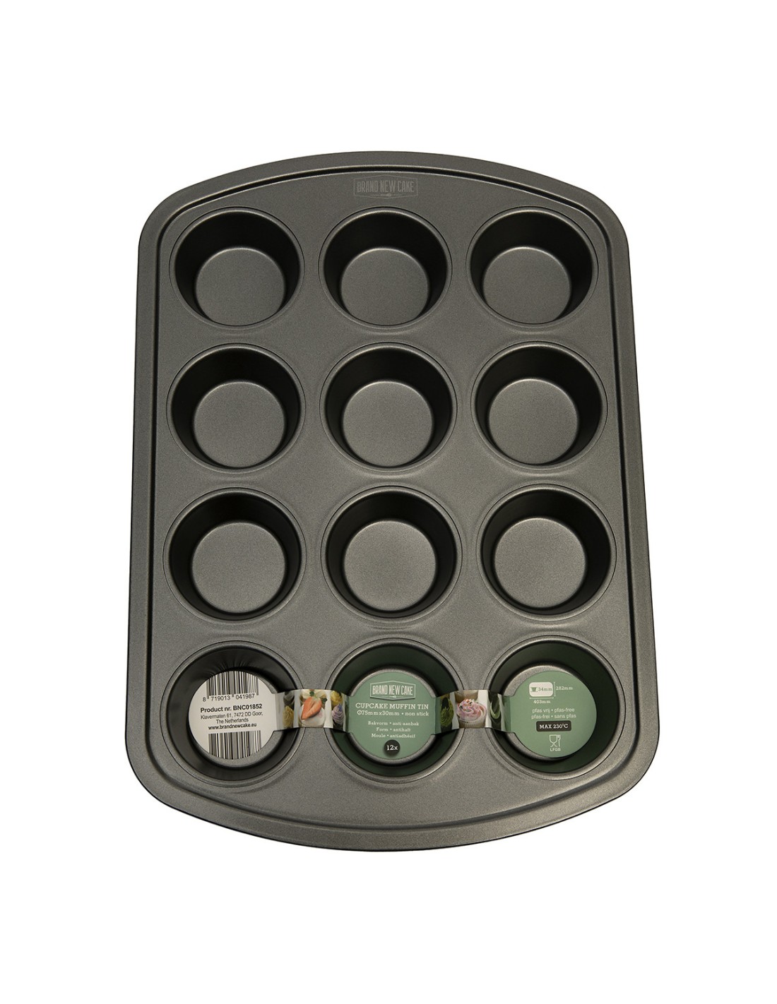 De BrandNewCake Cupcake / Muffin Bakvorm 12 stuks is een handige bakvorm voor allerlei soorten cupcakes en muffins. Dankzij het stalen materiaal van 0,6 millimeter is de bakvorm robuust en de hoogwaardige anti-aanbaklaag helpt om je baksels makkelijk uit de holtes te krijgen. De vorm is kras-, vlek- en corrosiebestendig, slijtvast en kan in de oven tot 230 °C. Verder is hij PFAS vrij en getest volgens LFGB en TÜV. Elke holte heeft een diameter van circa 7,5 centimeter met een hoogte van 3 centimeter.