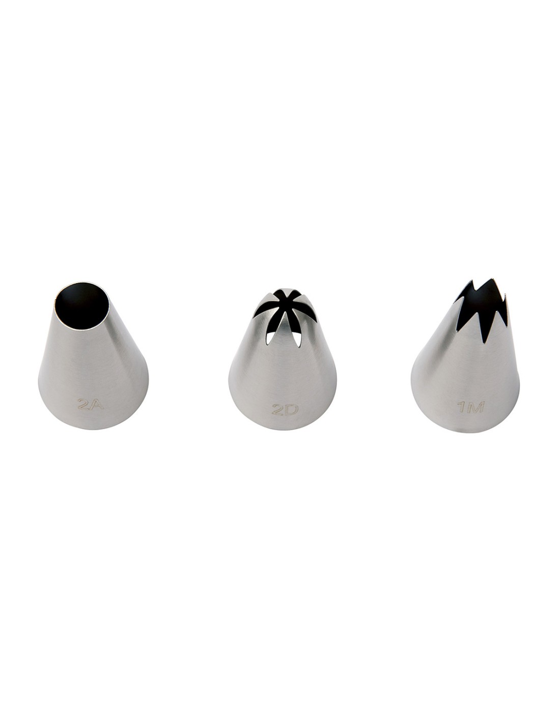 Geef een finishing touch aan je creaties met de BrandNewCake Decoratie Spuitmondjes Set/3 (1M, 2D, 2A). De set bevat drie populaire RVS spuitmondjes: 1M, 2D en 2A. Met 1M creëer je prachtige rozetten, swirls en klassieke gekartelde toeven. De 2D is handig voor het maken van gedetailleerde bloemen of bloesems. Tot slot maak je met 2A strakke lijnen, cijfers, letters, stippen en contouren.