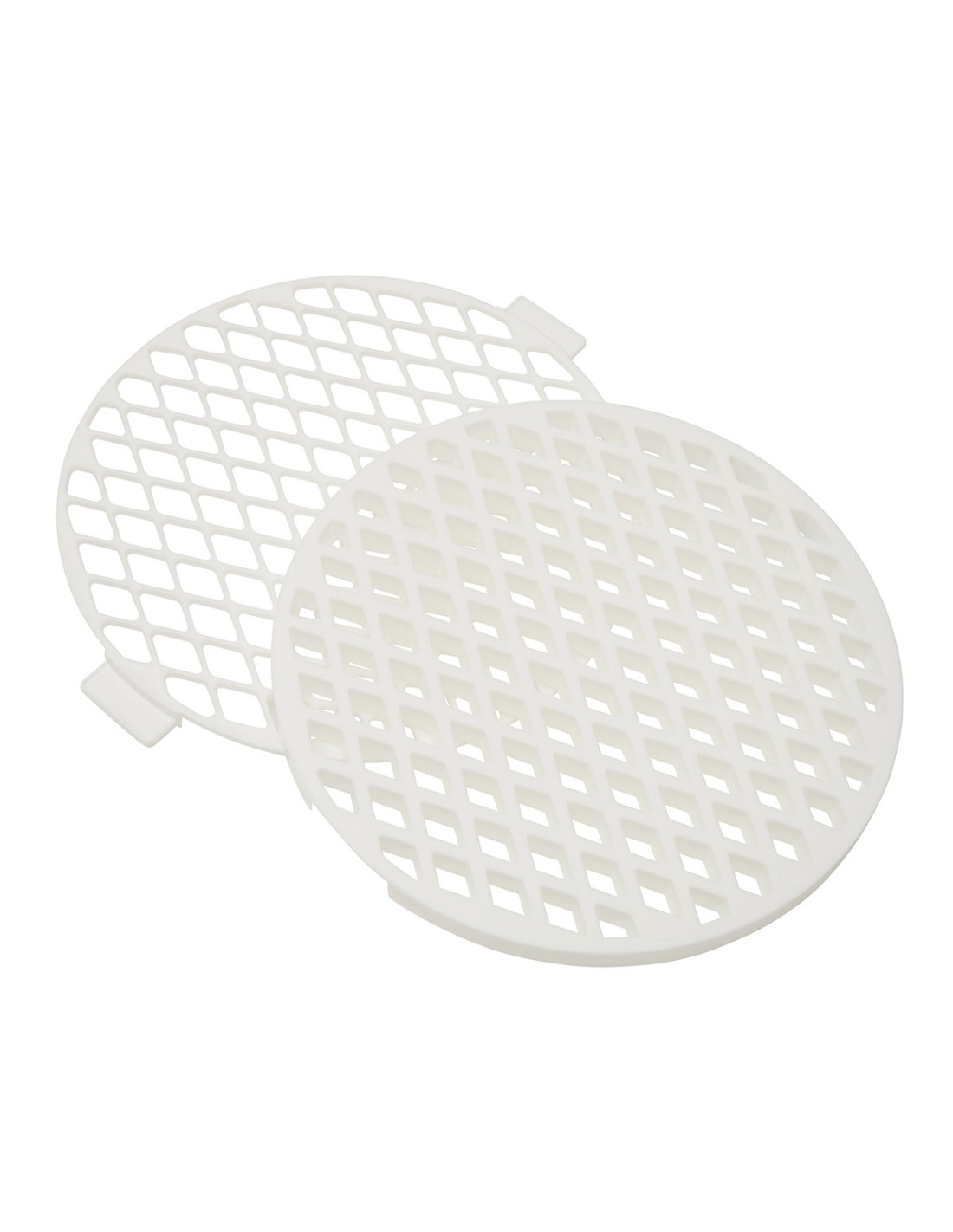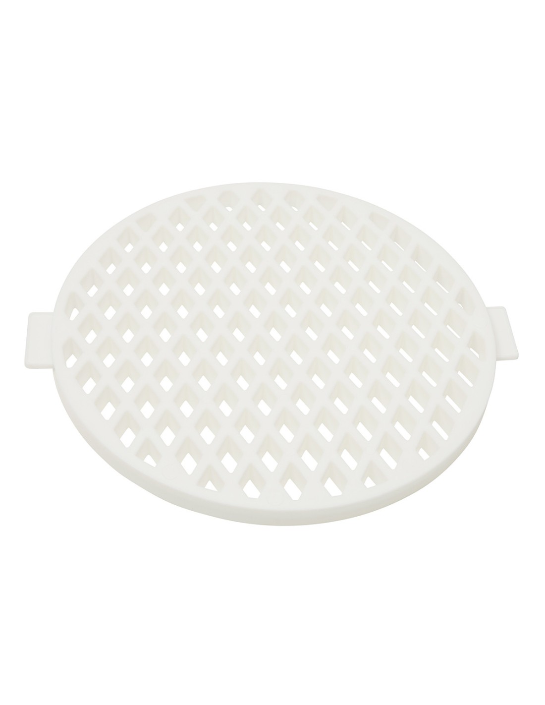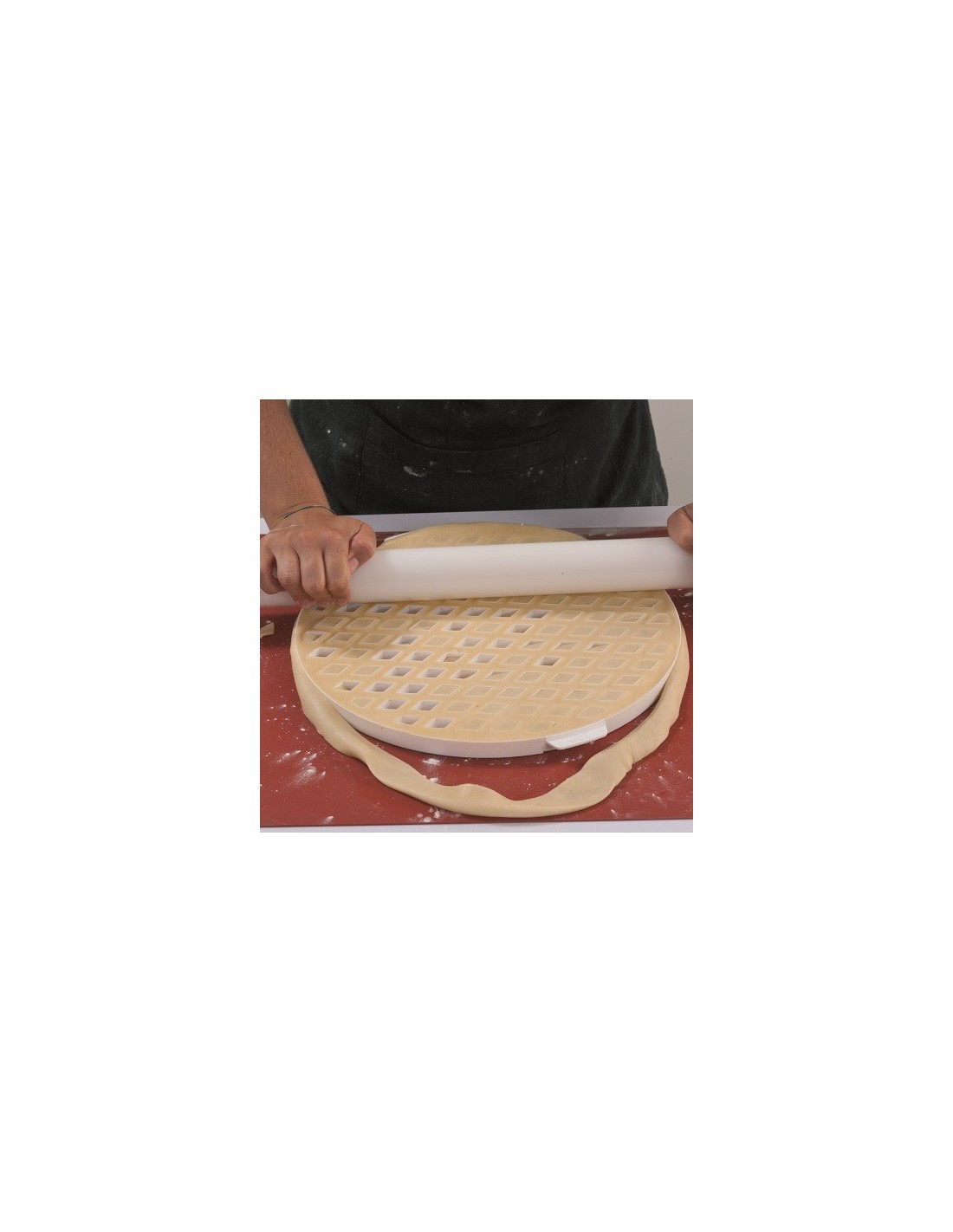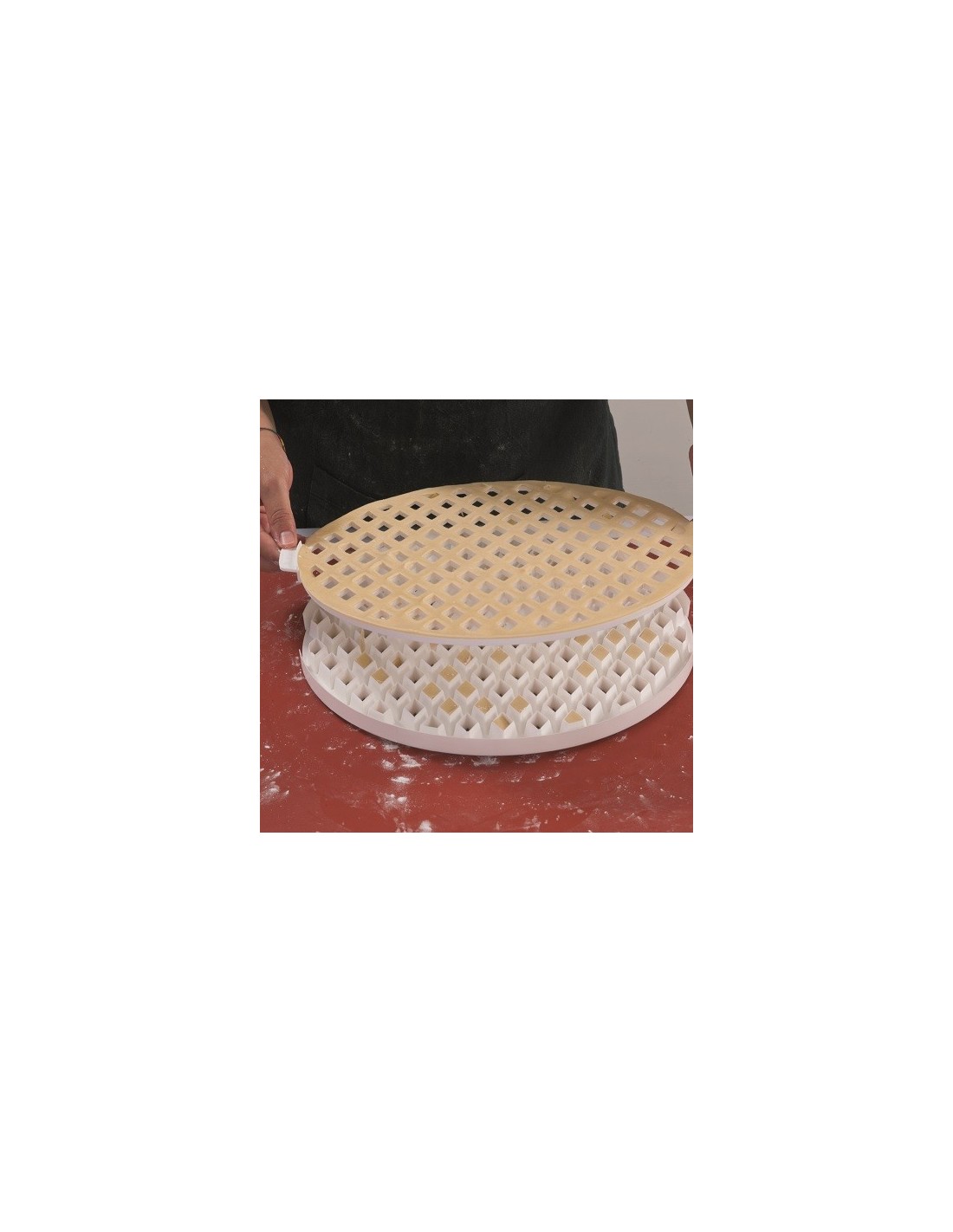 Rol je deeg uit, leg het op de stans met daarop het raster en druk licht aan met een roller. Er ontstaat een gelijkmatig patroon. Haal vervolgens het raster voorzichtig los, en gebruik het uitgesneden deeg om je taart mee af te werken.