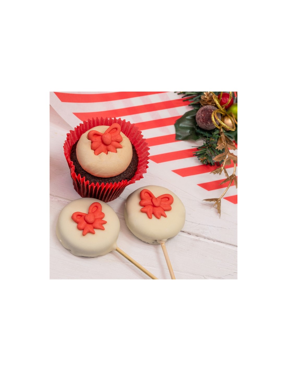 Elke rode strik is met de hand gespoten met royal icing. Deze feestelijke set is perfect om de rand van een taart mee te decoreren of om cupcakes mee te garneren.