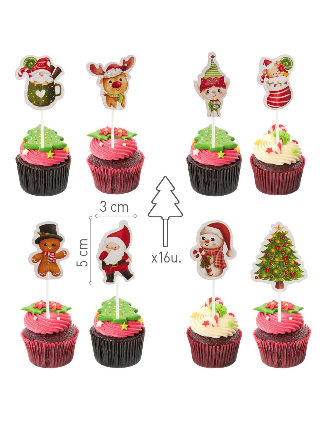 Set van 16 prikkers in schattig kerstdesign. Ideaal voor cupcakes.Inhoud: 16 toppers.