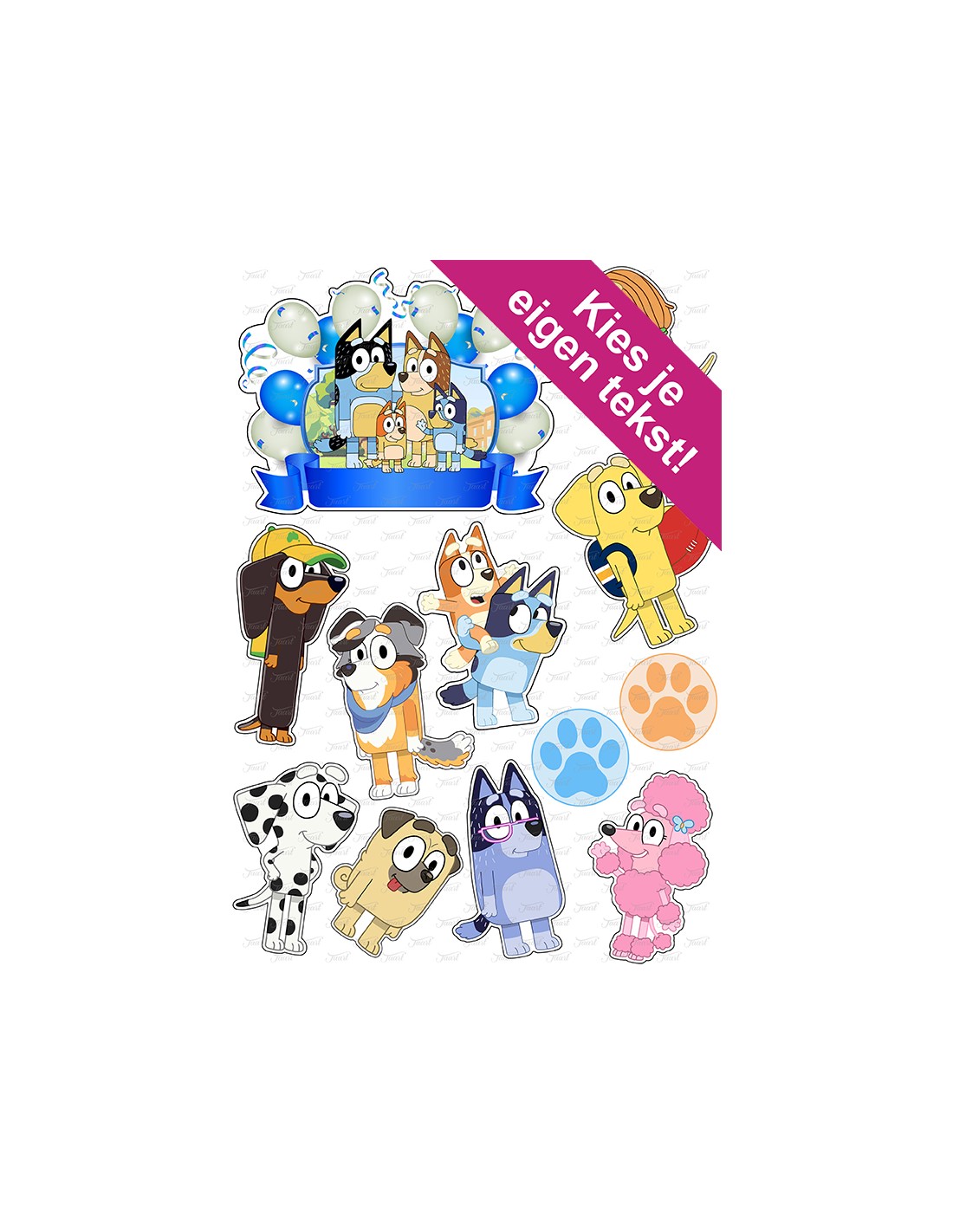 Maak eenvoudig uw eigen taarttopper! In onze handige ontwerpmodule kunt u zelf teksten en/of extra afbeeldingen toevoegen. Wij printen uw ontwerp op hoge kwaliteit A4 fotopapier (300 gram) in hoogglans. Met behulp van onze fotoprinter zorgen we voor het beste resultaat. Zelf hoeft u de afbeeldingen alleen nog maar uit te knippen en in elkaar te zetten. Uiteraard zijn de ontwerpen ook te gebruiken voor andere doeleinden.