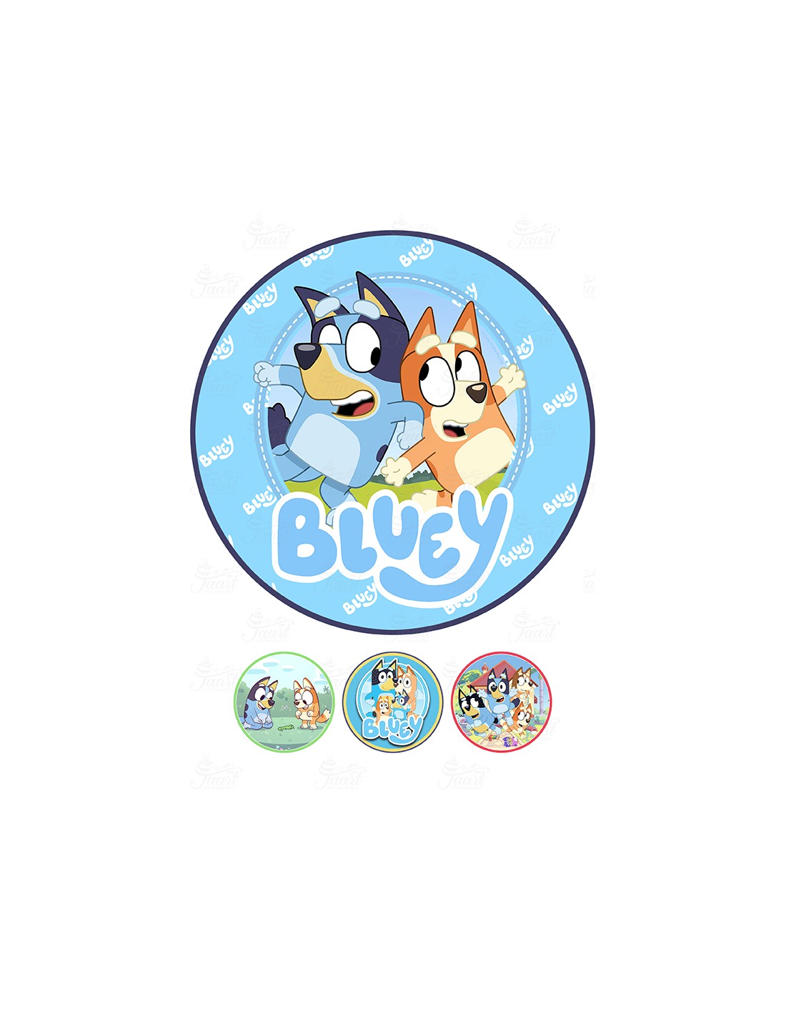 Een afbeelding van Bluey op een formaat van 20cm doorsnede. U ontvangt extra 3 kleine afbeeldingen van 5cm doorsnede.