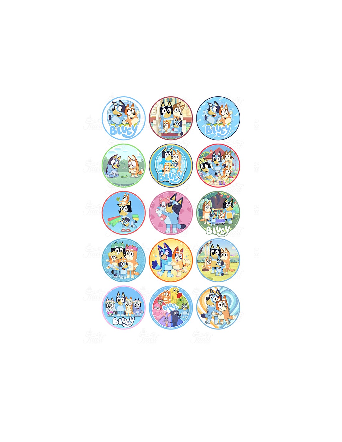 15 afbeeldingen van Bluey op een formaat van 5cm doorsnede.