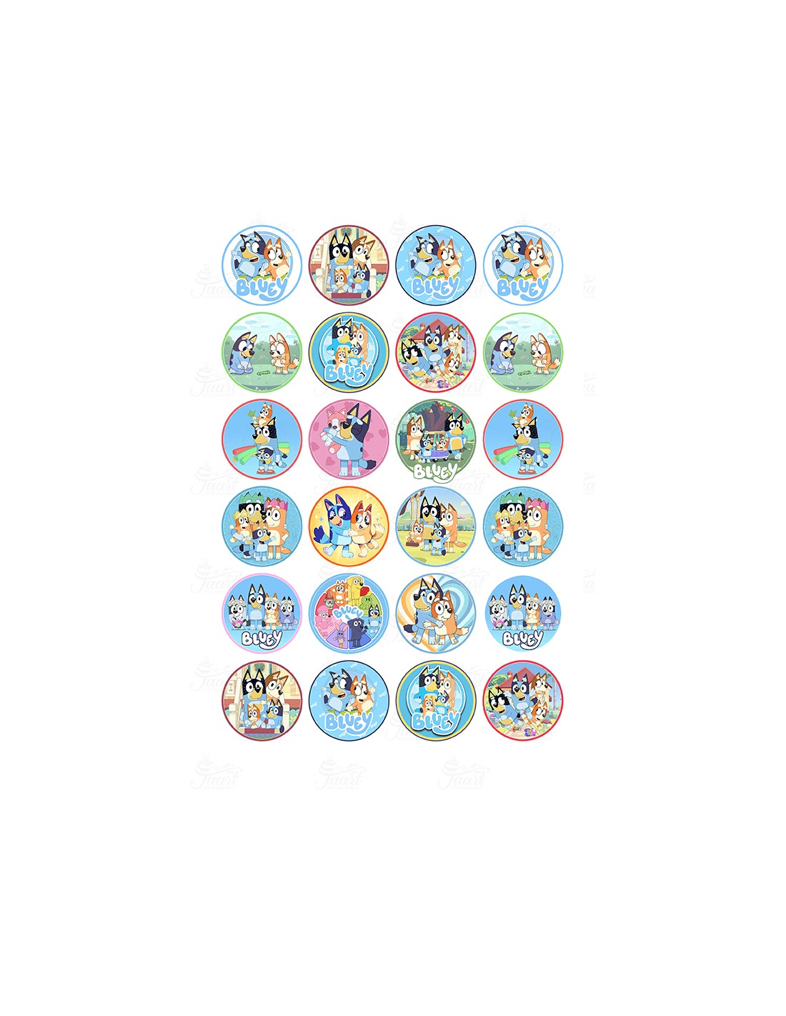 24 afbeeldingen van Bluey op een formaat van 4cm doorsnede.