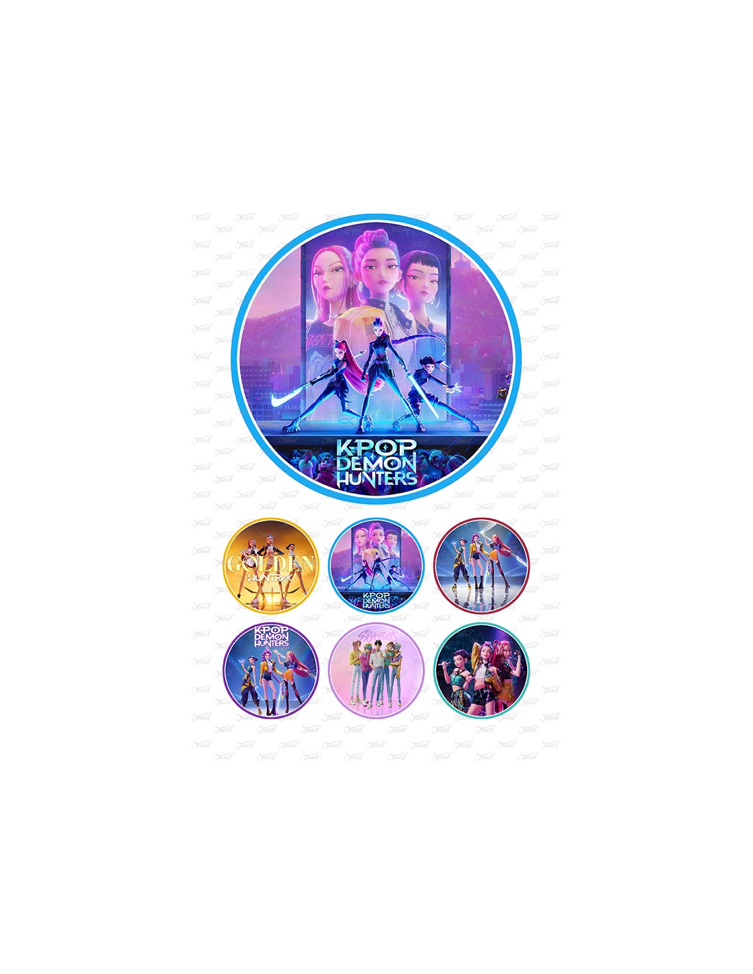 Een afbeelding van K-Pop Demon Hunters op een formaat van 15cm doorsnede. U ontvangt extra 6 kleine afbeeldingen van 5 cm doorsnede.