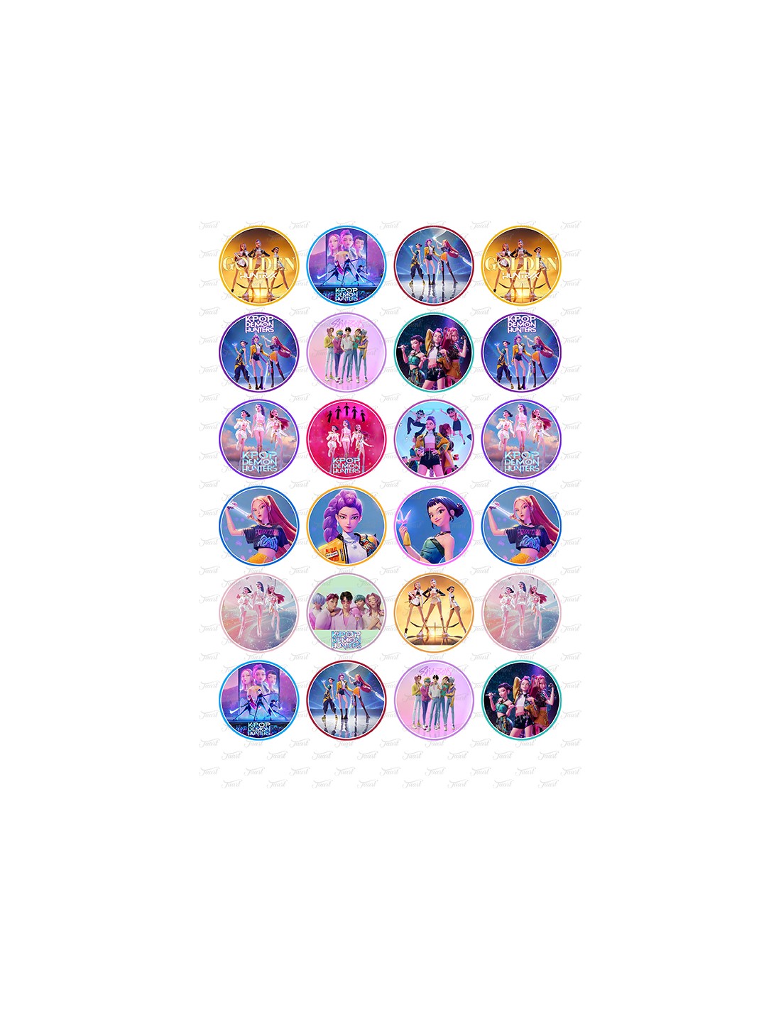 24 afbeeldingen van K-Pop Demon Hunters op een formaat van 4 cm doorsnede.