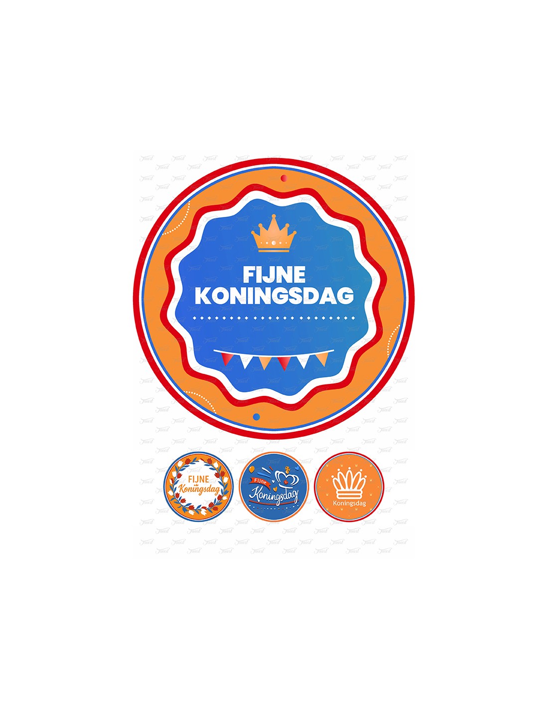 Een koningsdag afbeelding op een formaat van 20cm doorsnede. U ontvangt extra 3 kleine afbeeldingen van 5cm doorsnede.