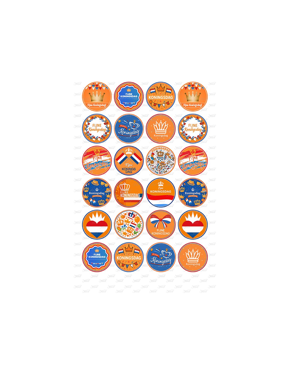 24 koningsdag afbeeldingen op een formaat van 4 cm doorsnede.