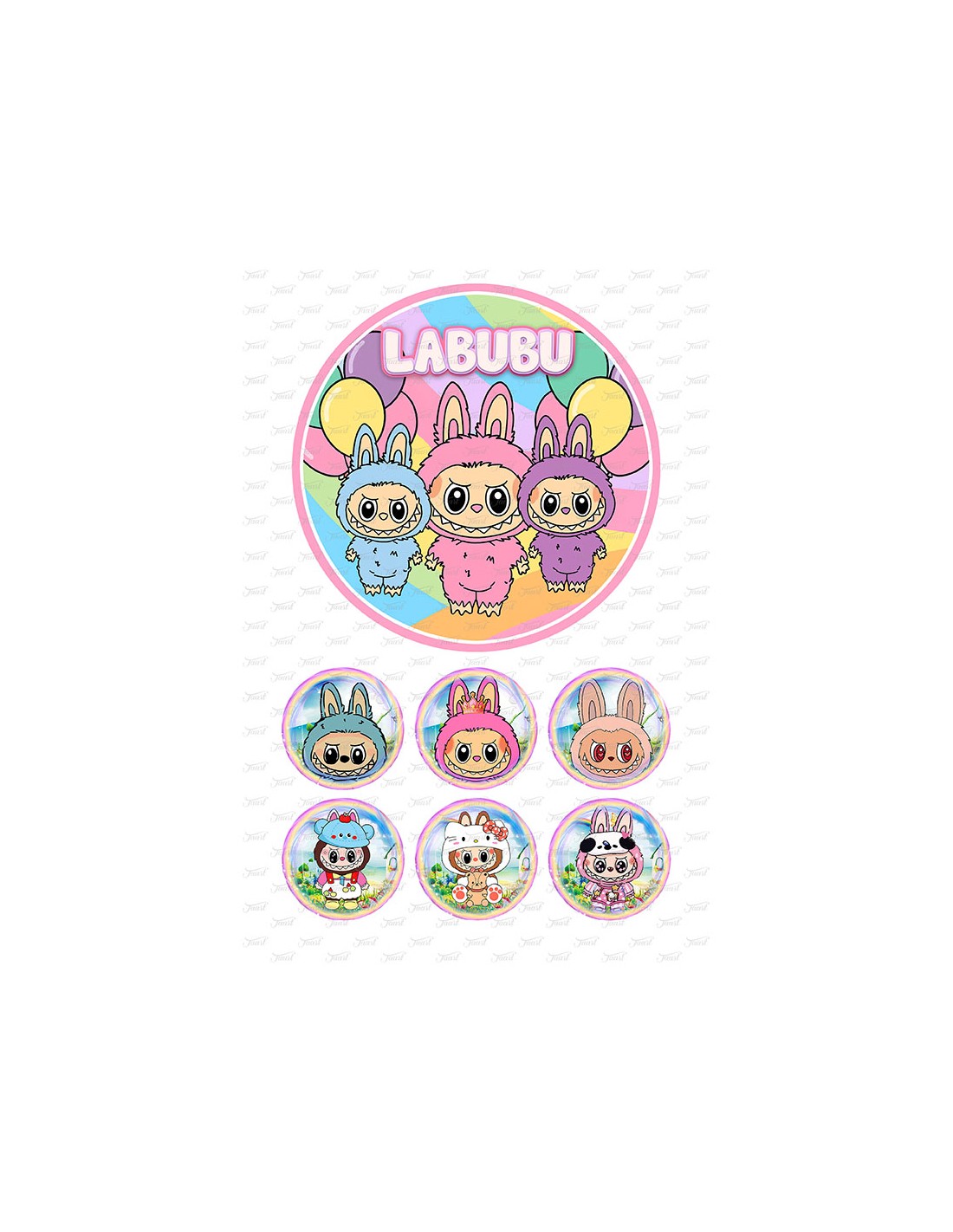 Een afbeelding van Labubu op een formaat van 15cm doorsnede. U ontvangt extra 6 kleine afbeeldingen van 5cm doorsnede.
