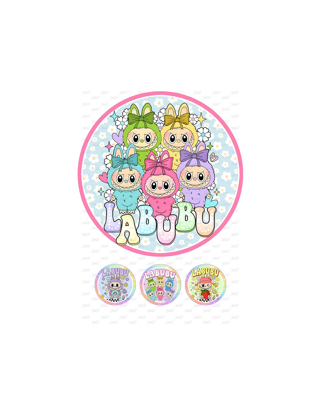 Een afbeelding van Labubu op een formaat van 20cm doorsnede. U ontvangt extra 3 kleine afbeeldingen van 5cm doorsnede.