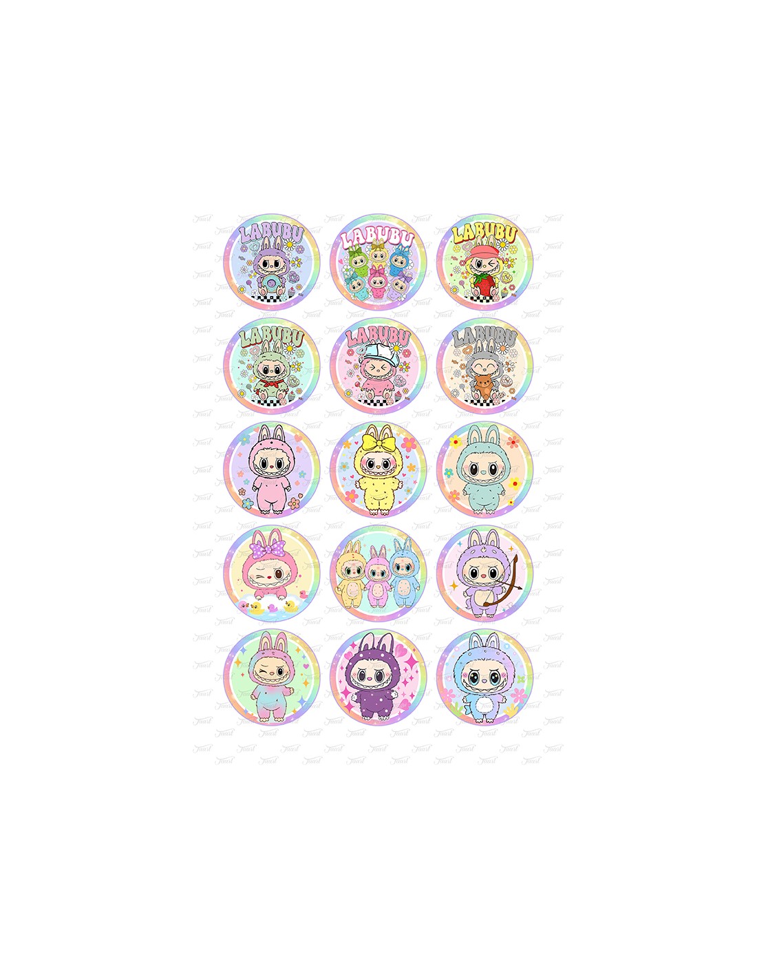 15 Labubu afbeeldingen op een formaat van 5cm doorsnede.