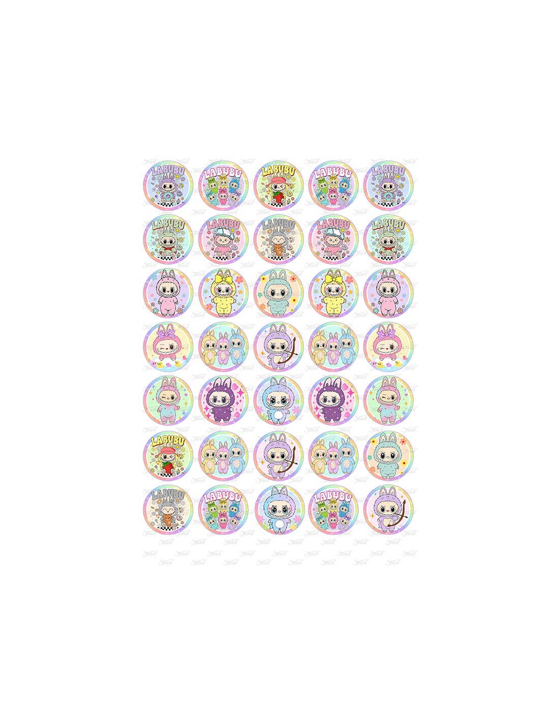 35 Labubu afbeeldingen op een mini cupake formaat van 3,5 cm doorsnede.