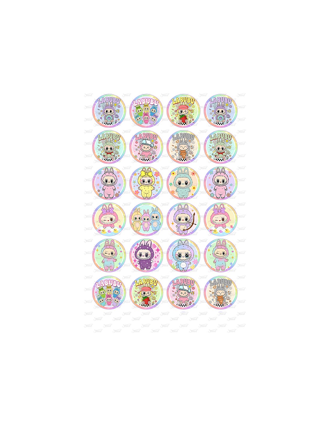 24 Labubu afbeeldingen op een mini cupake formaat van 4 cm doorsnede.
