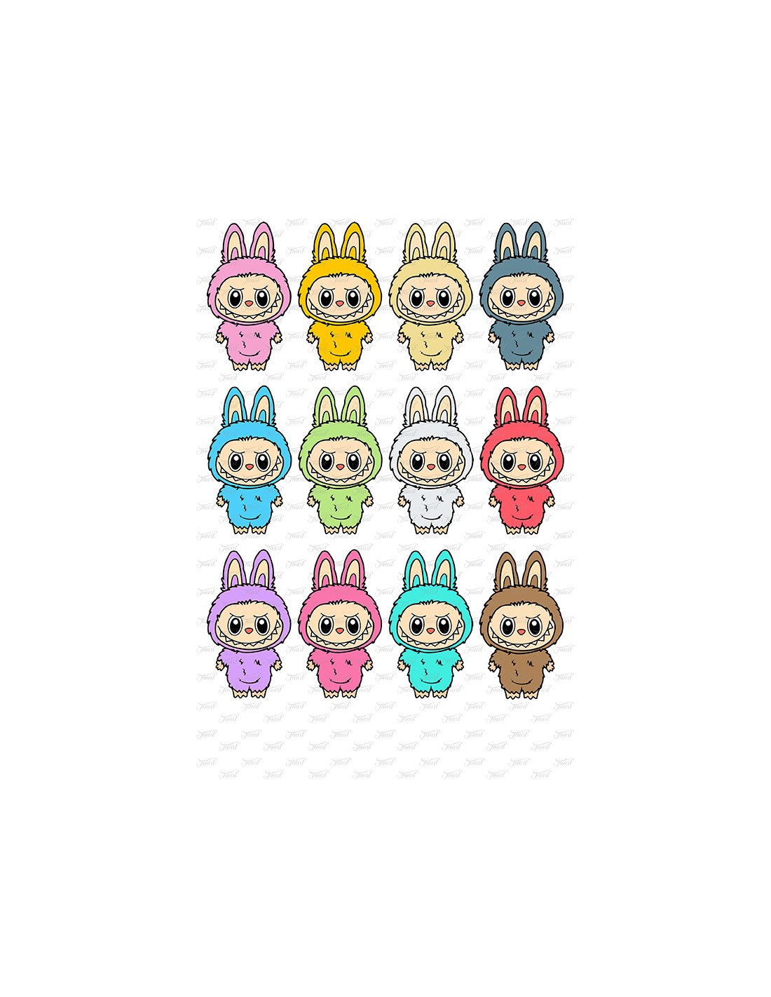 12 Labubu figuren op een formaat van 7,5 cm hoog.