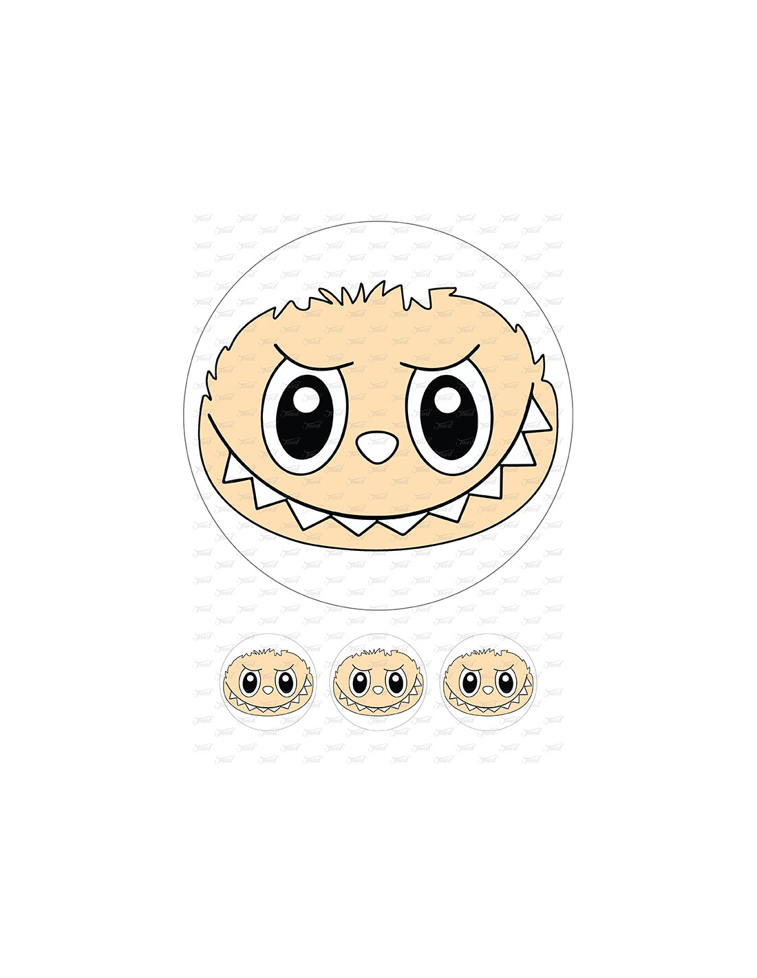 Een afbeelding van een Labubu gezicht op een formaat van 20cm rond. U ontvangt extra 3 kleine afbeeldingen van 6 cm breed.