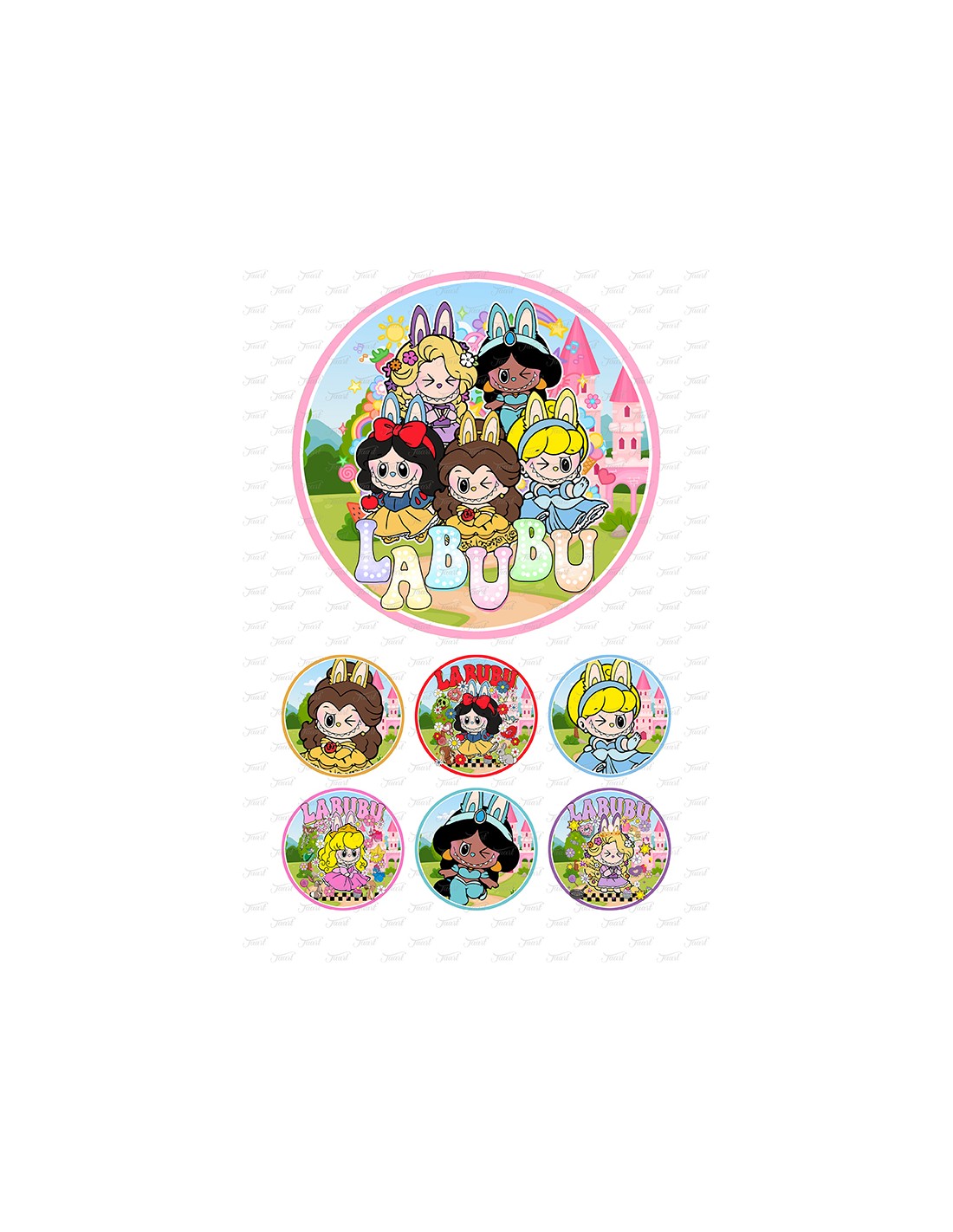 Een afbeelding van Labubu op een formaat van 15cm doorsnede. U ontvangt extra 6 kleine afbeeldingen van 5cm doorsnede.