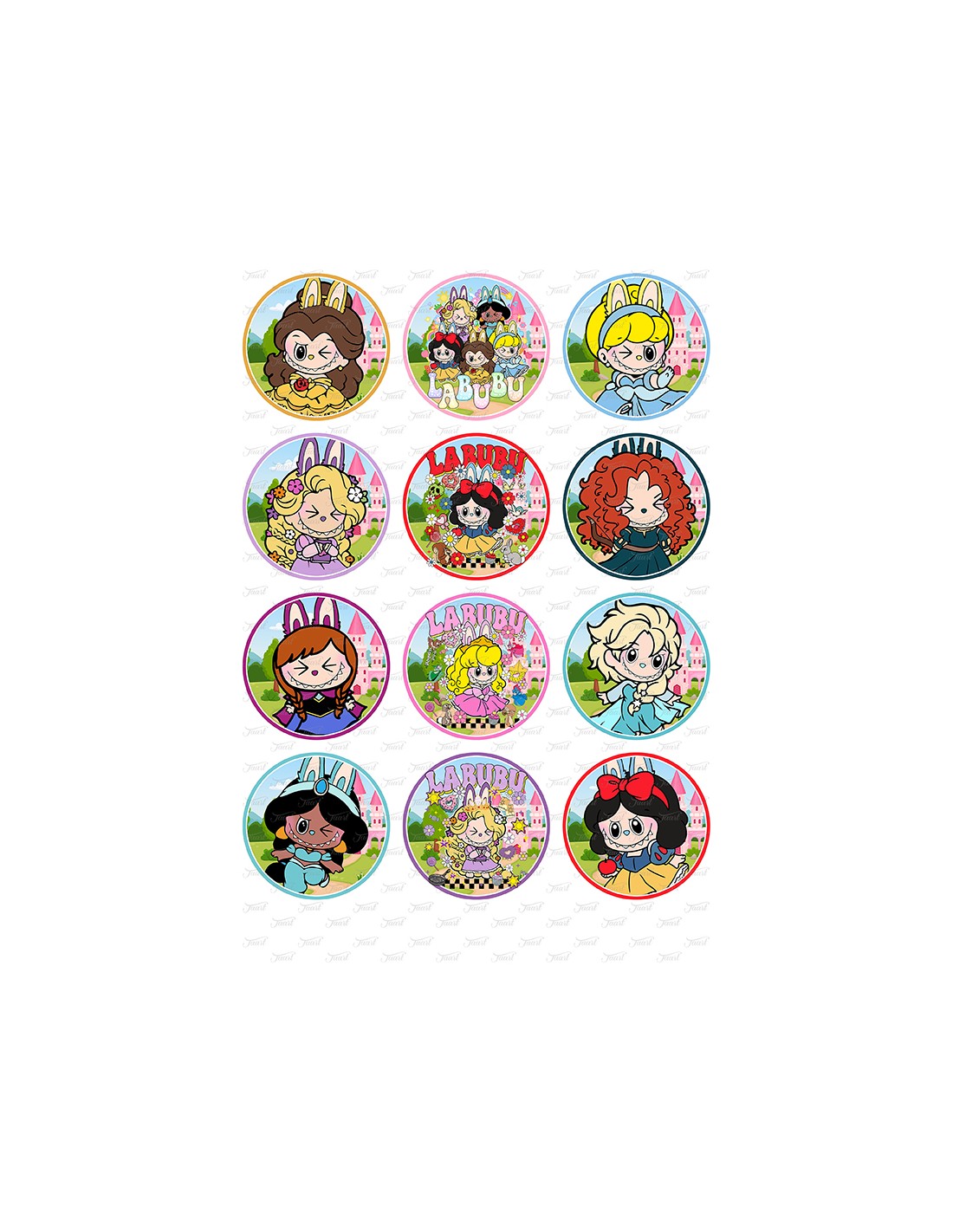 12 Labubu afbeeldingen op een formaat van 6 cm doorsnede.