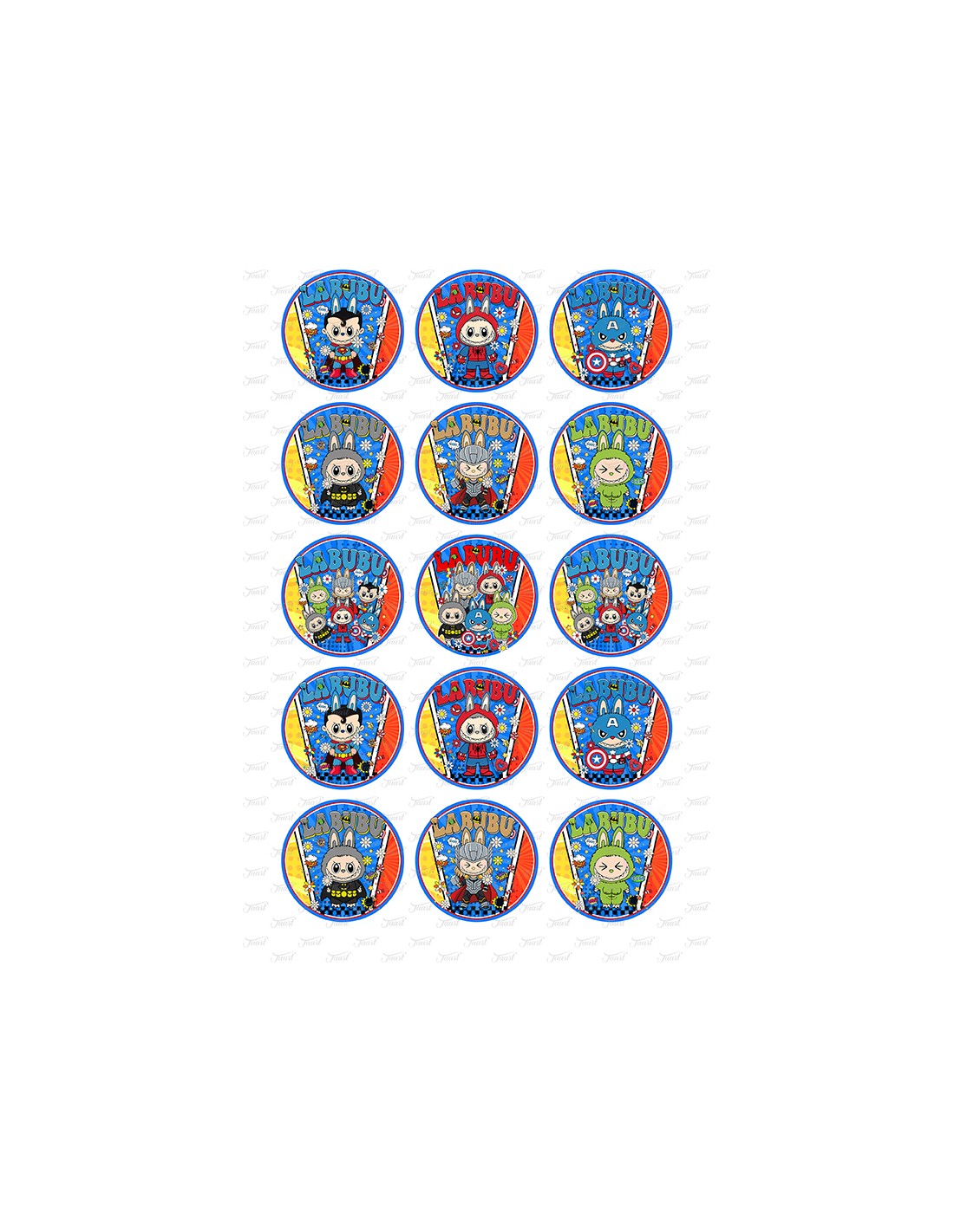 15 Labubu afbeeldingen op een formaat van 5cm doorsnede.