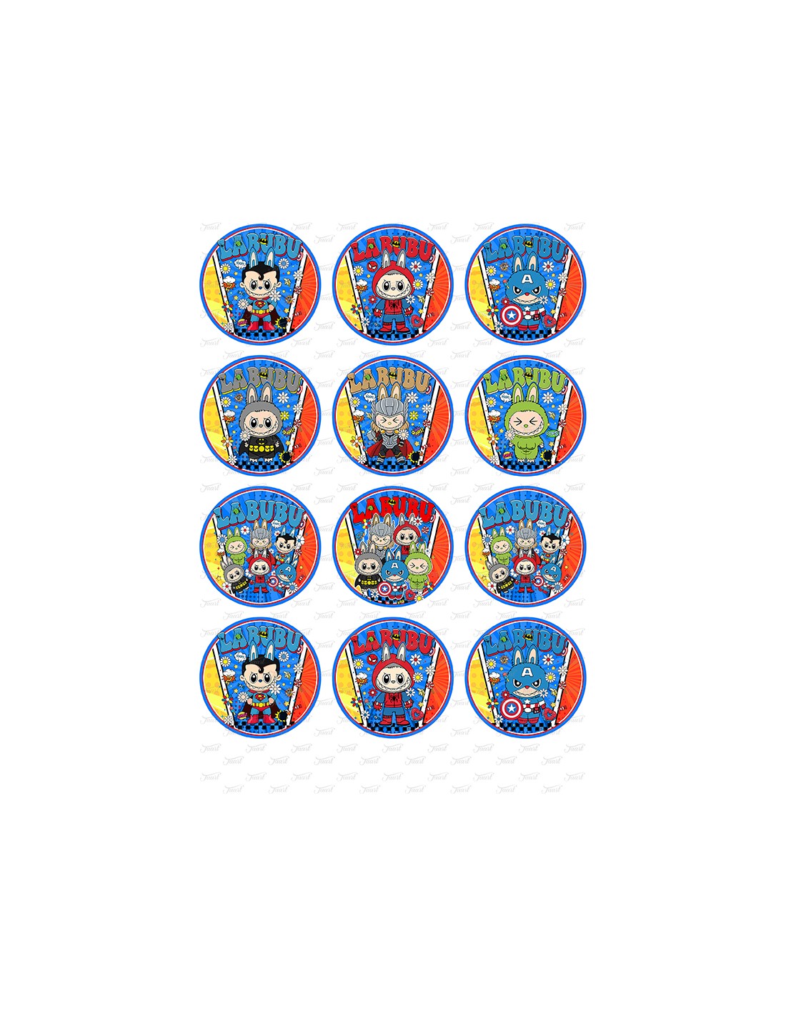 12 Labubu afbeeldingen op een formaat van 6 cm doorsnede.