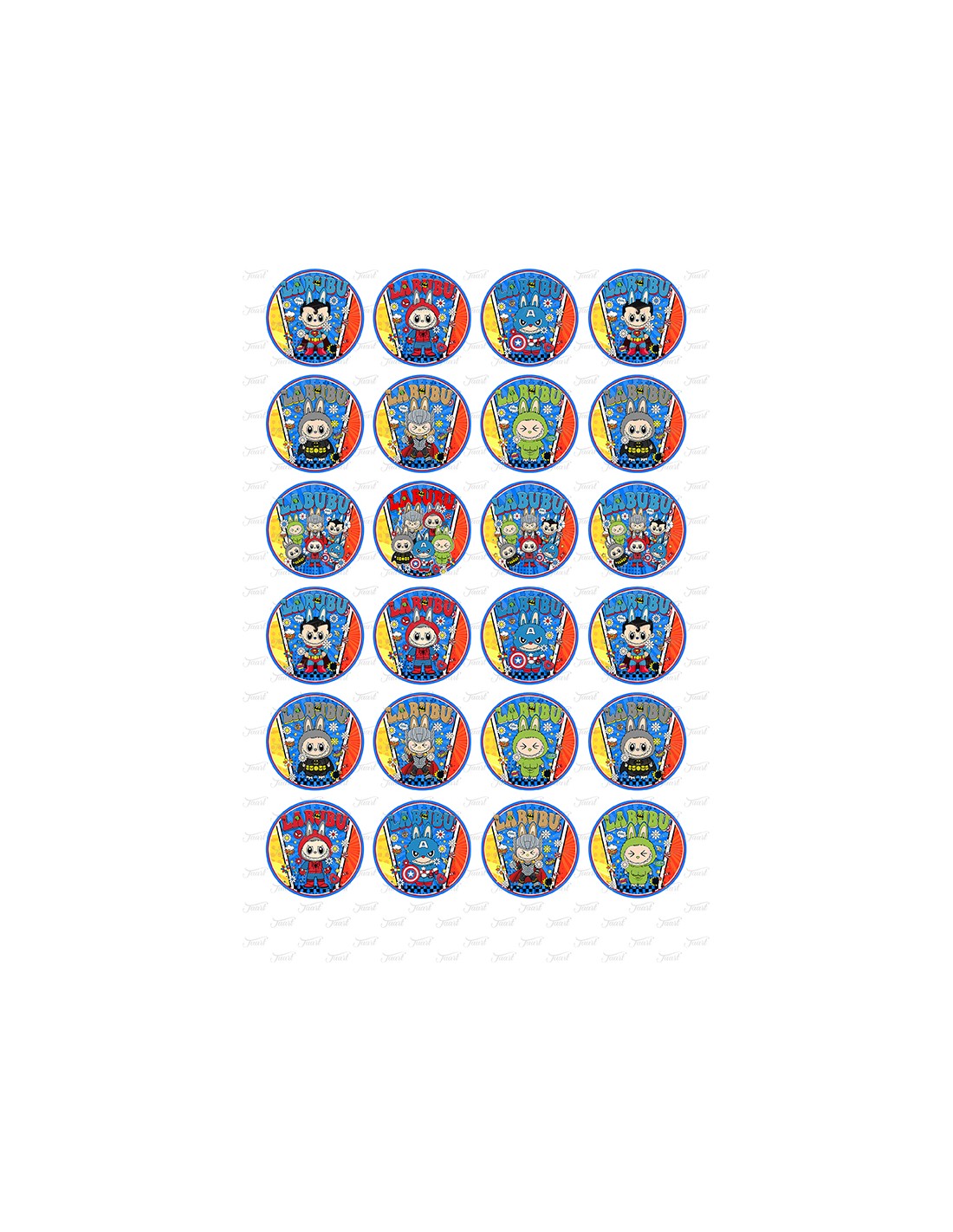 24 Labubu afbeeldingen op een mini cupake formaat van 4 cm doorsnede.