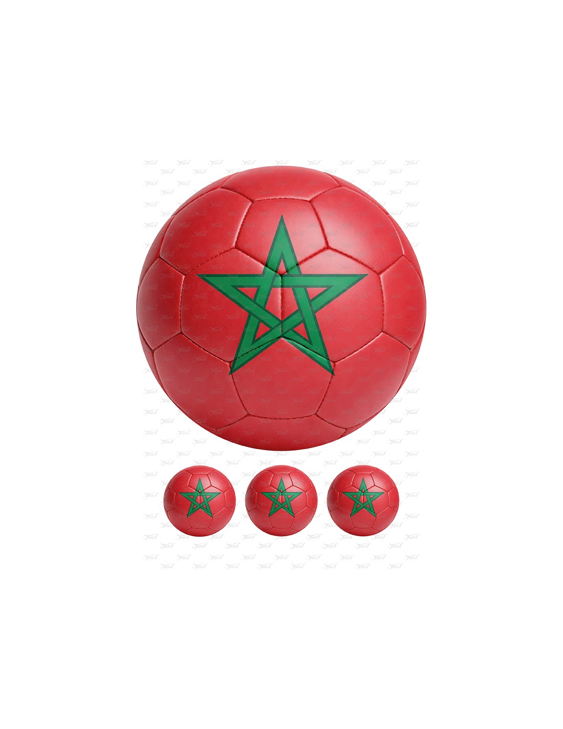 Een afbeelding van een voetbal met de Marokkaanse vlag op een formaat van 20cm doorsnede. U ontvangt extra 3 kleine afbeeldingen van 5cm doorsnede.