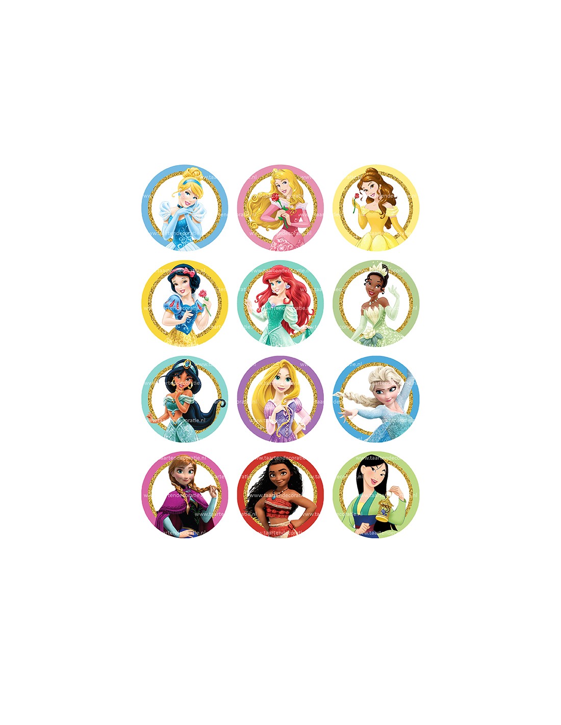 12 afbeeldingen van Prinsessen op een cupcake formaat van 6cm doorsnede.