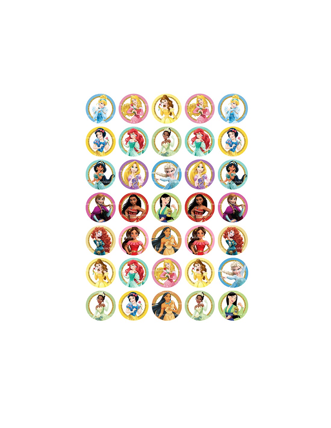 35 afbeeldingen van Prinsessen op een mini cupcake formaat van 3,5cm doorsnede.