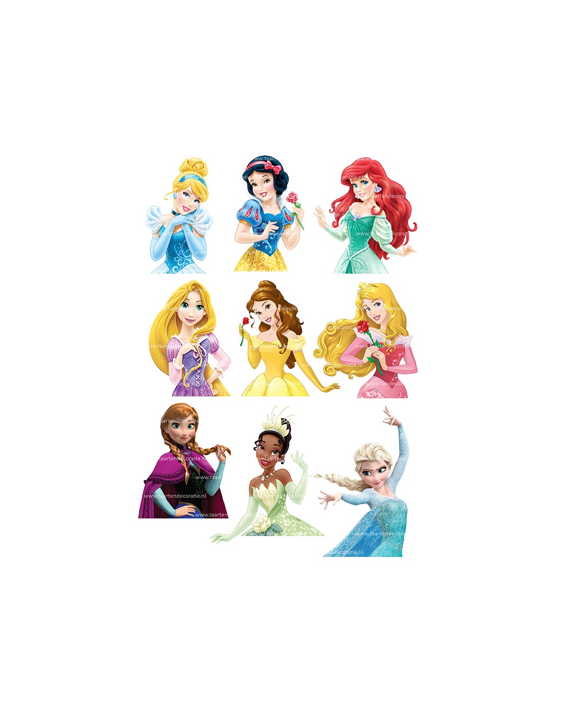 9 verschillende prinsessen welke gebruikt kunnen worden om zelf de jurk te maken. Formaat 8 cm hoog per prinses.