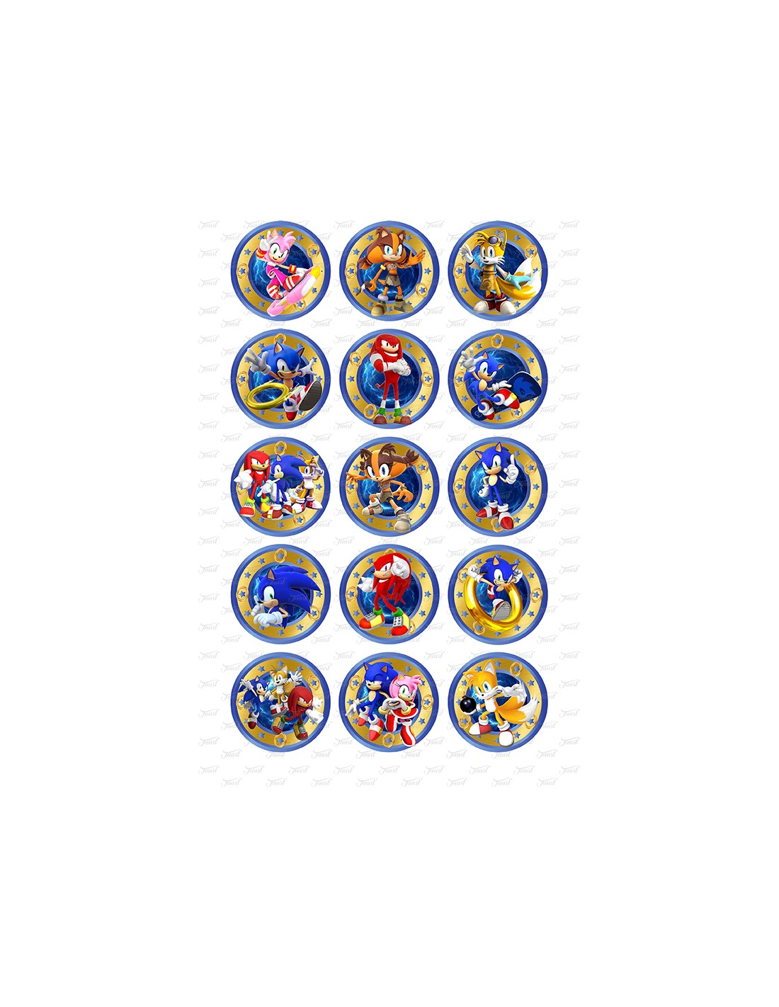 15 afbeeldingen van Sonic the Hedgehog op cupcakeformaat van 5cm. Dit formaat is ideaal als u nog een klein randje over wil houden.