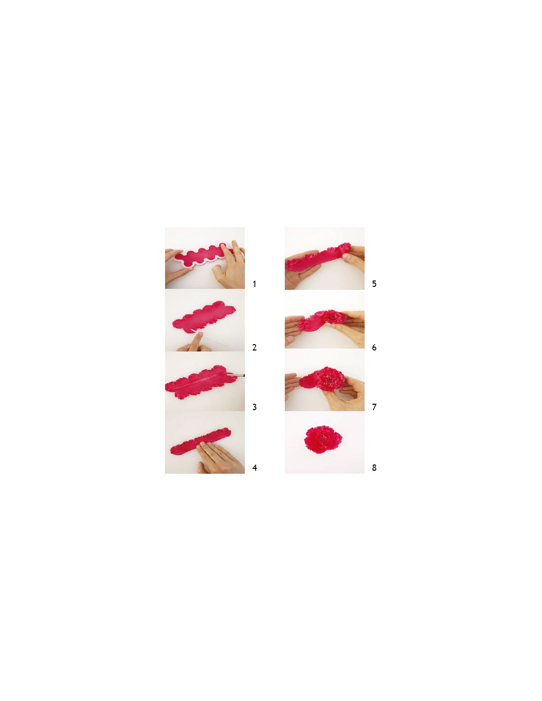Steek de vorm uit een stuk fondant, pak een frilling tool en rol heen en weer langs de randen. Smeer een streep lijm in het midden en plak ze tegen elkaar. Rol voorzichtig het fondant op in je hand en vouw de blaadjes naar buiten. Voor het maken van grotere anjers, voeg je een derde strook blaadjes toe.