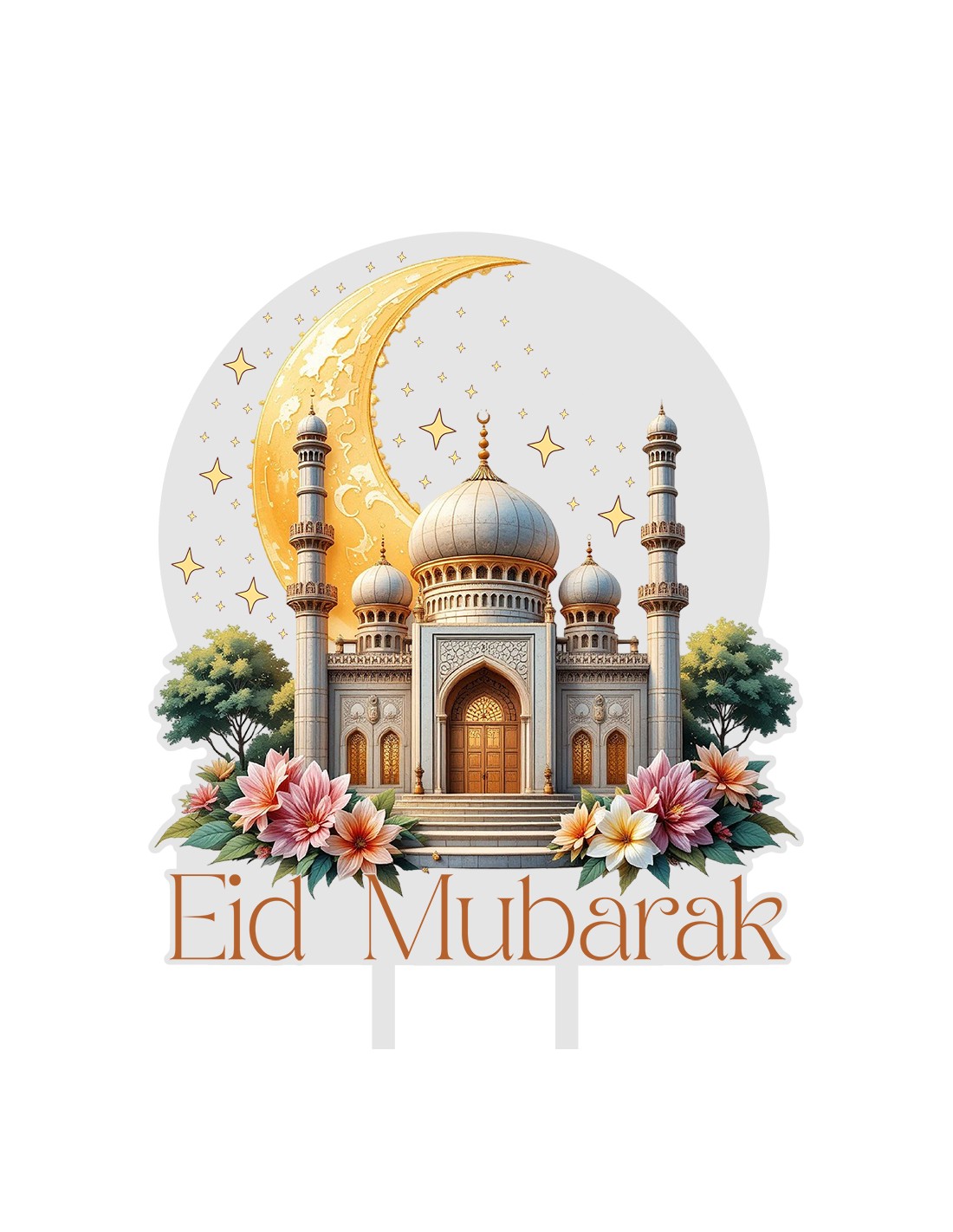 Een unieke full-colour taarttopper Eid Mubarak. Met onze bijzondere printtechniek printen we uw ontwerp direct op lasergesneden transparant acryl of op berkenhout. De gebruikte inkt is krasvast en verkleurd niet. Acryl wordt aan de achterzijde geprint om een perfecte glans te garanderen. Hout is de juiste keuze voor een rustiek resultaat. Hout printen we aan de voorzijde.