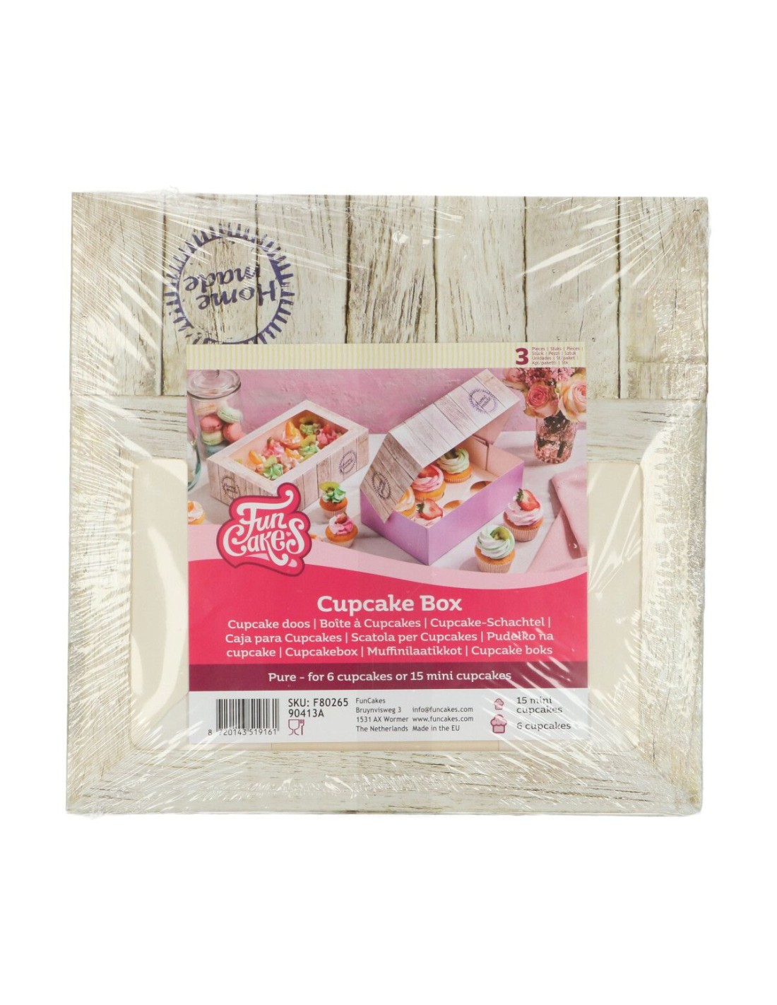 Prachtige cupcake doos van FunCakes in houtlook! Ideaal voor het verpakken en vervoeren van cupcakes en muffins. De doos wordt geleverd met insert, zodat je cupcakes netjes op hun plaats blijven tijdens transport.