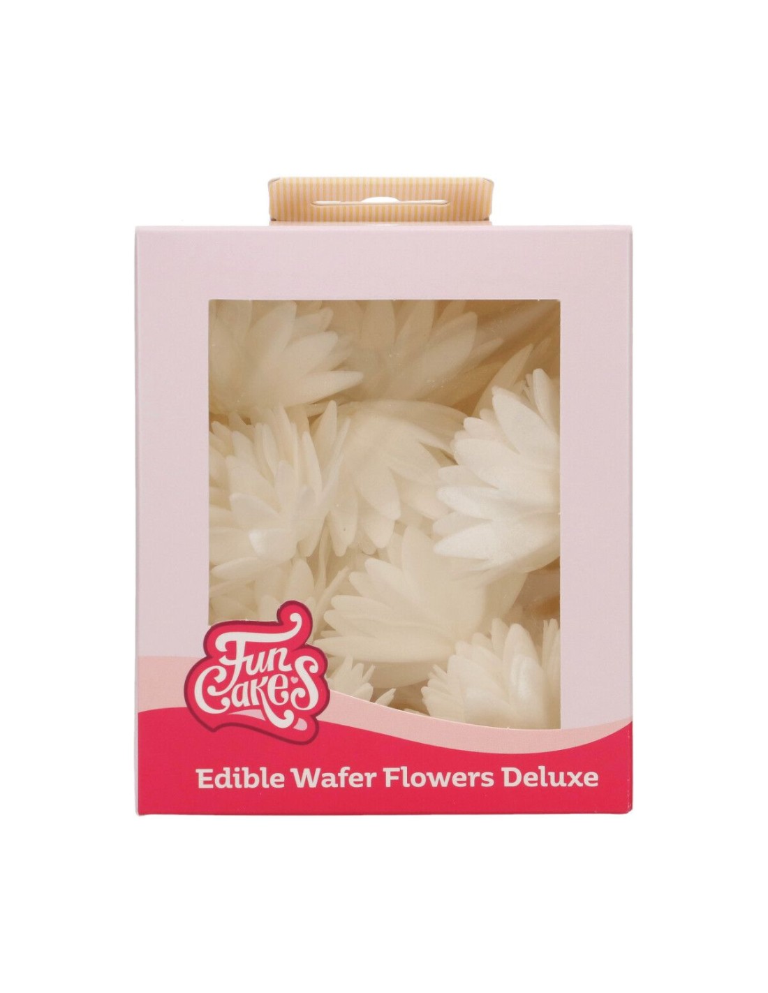 Laat je lekkernijen bloeien met de FunCakes Edible Wafer Flowers Deluxe! Met deze kant-en-klare bloemen geef je je traktaties een vrolijke, indrukwekkende uitstraling zonder enige moeite. De bloemen zijn verkrijgbaar in verschillende ontwerpen en perfect te combineren voor je eigen kleurrijke combinaties. Kies voor een grote bloemenexplosie of juist een subtiele maar stijlvolle touch voor je taarten. Deze verpakking bevat 14 witte middelgrote asters van 5,5 cm.