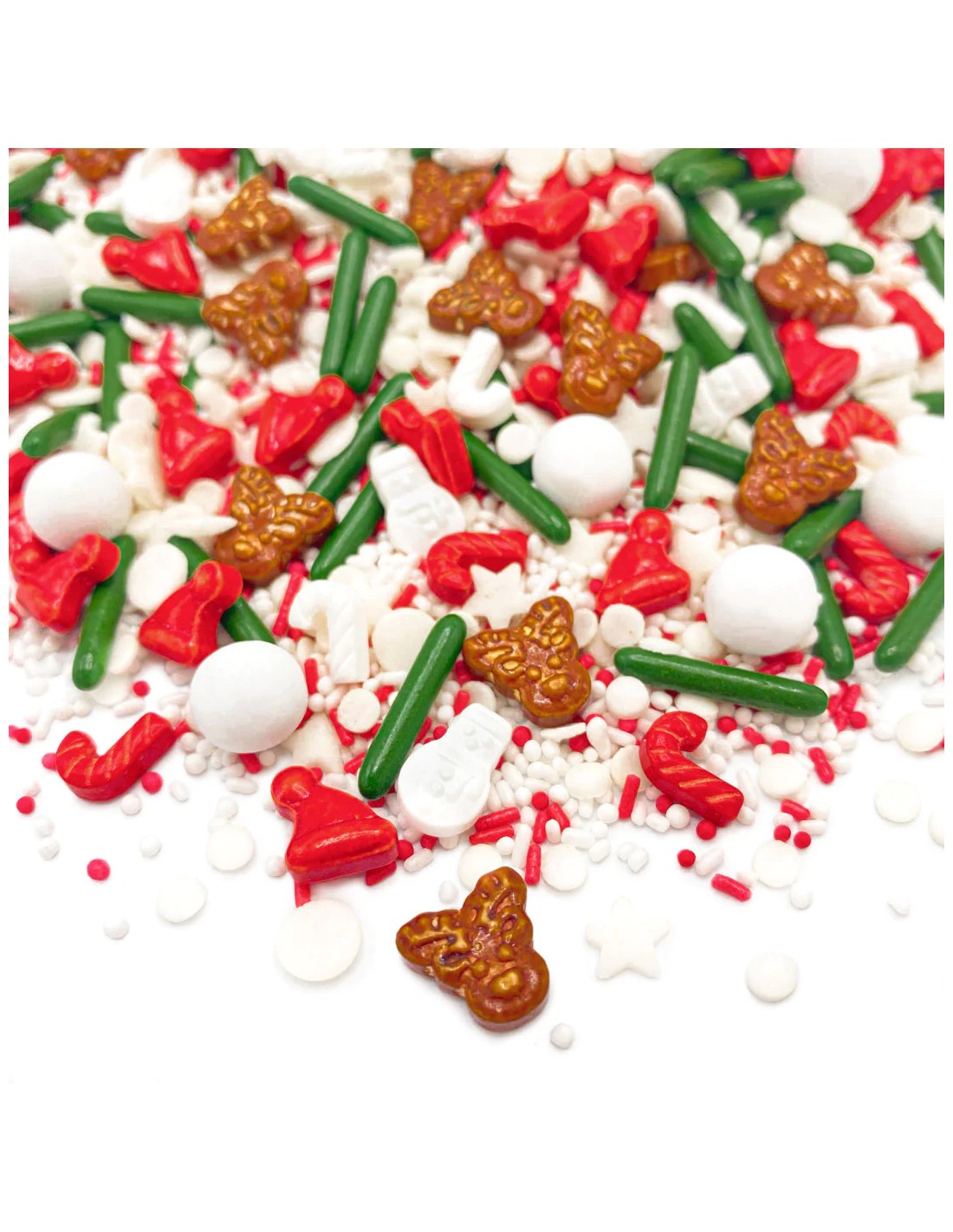 Deze strooimix geeft ons absoluut kerstsfeer! Rendiertjes, zuurstokken, sneeuwpoppen en kerstmutsen brengen ons meteen in de mooiste tijd van het jaar en het kerstbakken kan beginnen! Een absolute kerstklassieker met alles wat je kersthart begeert! Waar wacht je op? Talloze kerstkoekjes, cupcakes en taarten wachten erop om door jou versierd te worden!