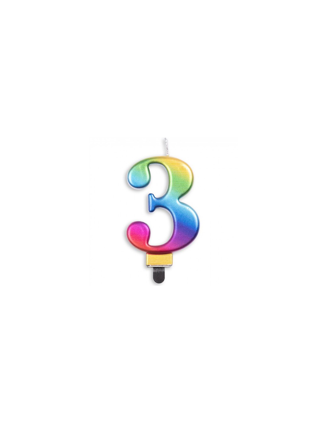 Nummerkaars in de vorm van het cijfer 3 in diverse metallic regenboog kleuren.