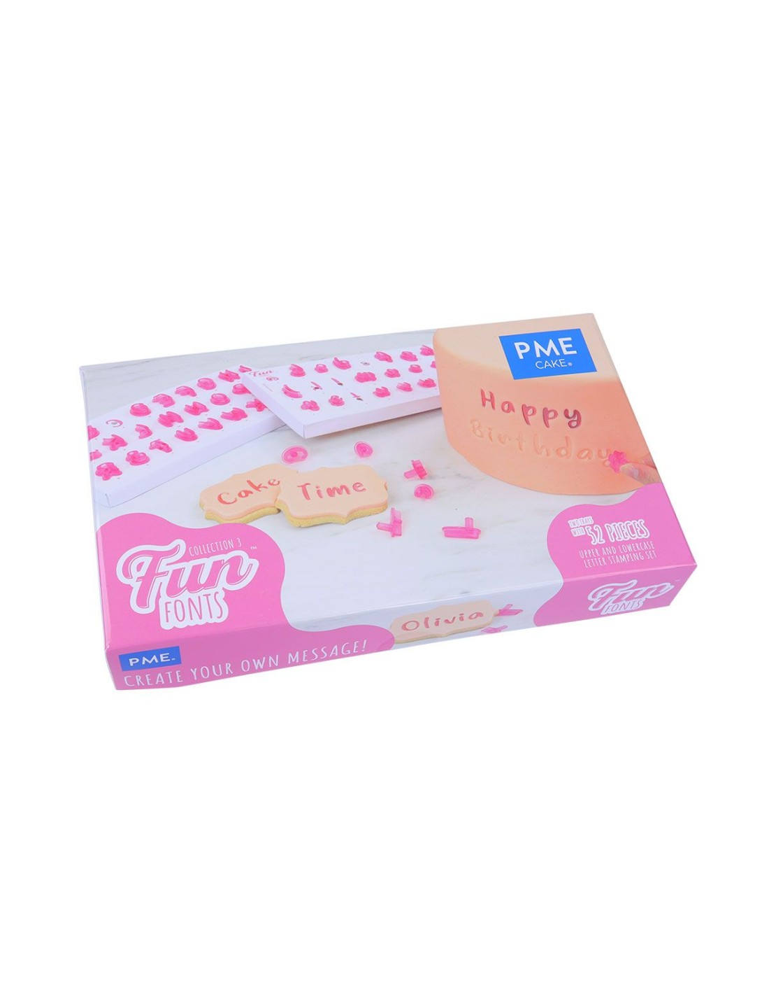 Voeg een persoonlijke boodschap toe aan jouw taarten en traktaties met PME Fun Fonts! De stempels kunnen gebruikt worden op rolfondant, botercrème, gum paste, modelleerchocolade en marsepein. D