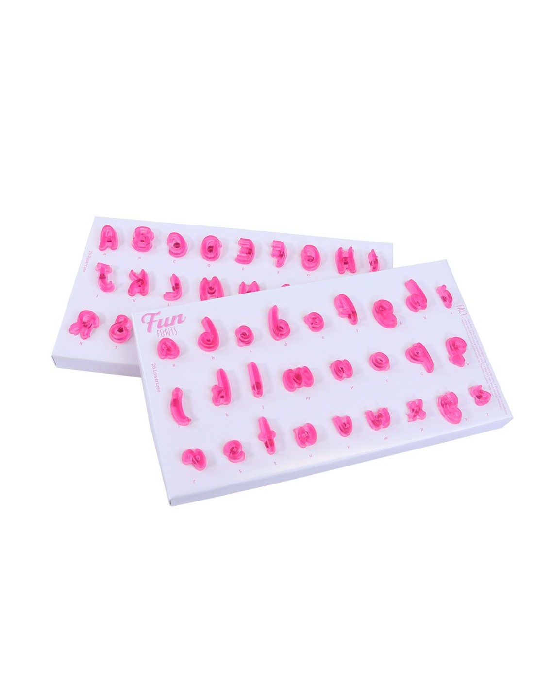 e set is gemaakt van kwalitatief voedselveilig plastic en bevat 52 stempels: 26 hoofdletters en 26 kleine letters. De stempels zijn gemaakt van licht doorzichtig blauw plastic en voorzien van een centrale lijn op de achterzijde die je helpen bij het positioneren van de letters. Inclusief een gegoten handvat voor gemakkelijk gebruik en er is geen aditioneel gereedschap of materiaal nodig.