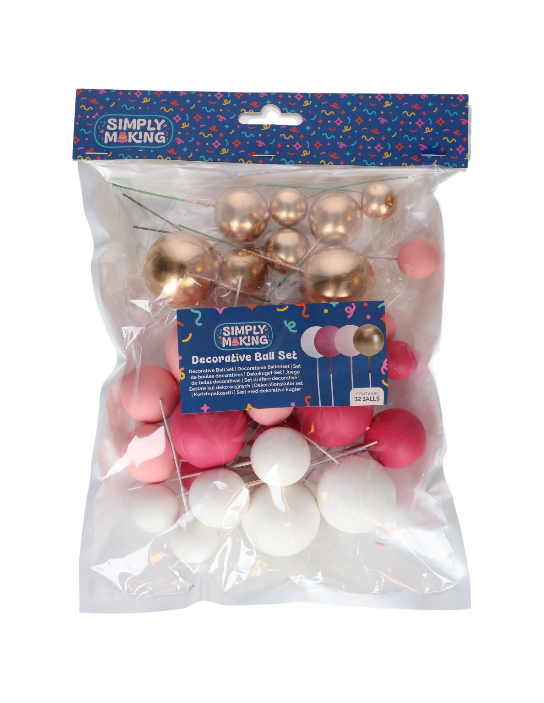 De set bestaat uit 32 decoratieballen in verschillende groottes en kleuren. Door de ballen op verschillende hoogtes te plaatsen of ze te combineren in kleine groepjes creëer je gemakkelijk een dynamisch en feestelijk design. Zo maak je van iedere taart een echte blikvanger op de feesttafel.