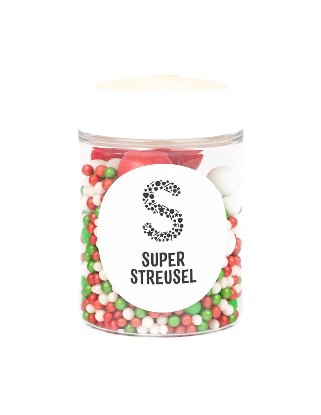 In de meest kerstige kleuren rood, groen en wit - zo mooi van buiten uuen super knapperig van binnen! Onze krokante balletjes hebben een superlekkere knapperige kern, omhuld met zachte chocolade. De kers op de taart of de kroon op je kerstdessert. Wij zeggen: knapperig, knapperig, knapperig! Eetbare strooisels uit Duitsland: Super Streusel! Voor het decoreren en versieren van taarten, cup cakes, drip cake, koekjes, wafels, ijs & co.