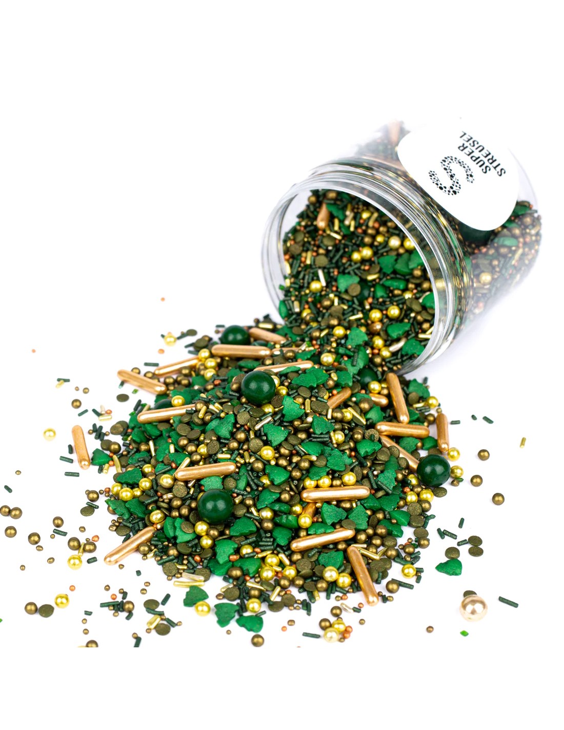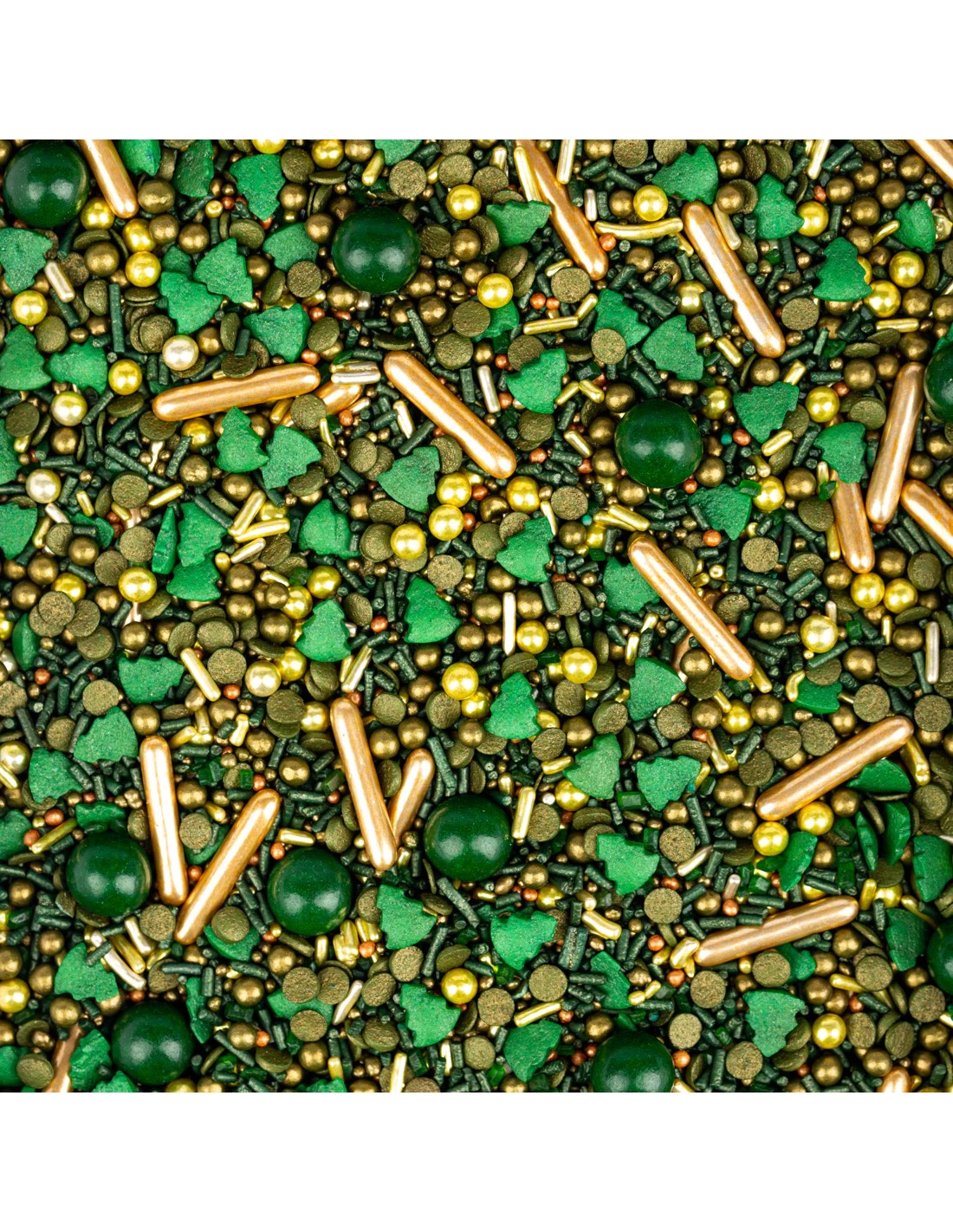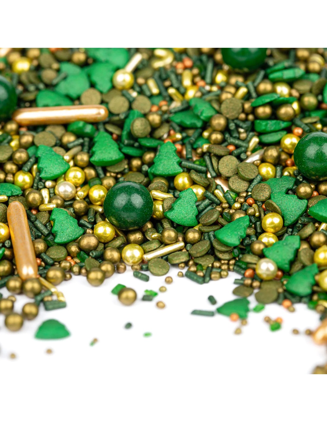 O kerstboom, o kerstboom, wat zie je er mooi uit op onze koekjes! We kunnen de koekjes niet meer zien door alle hagelslag. Je kunt nooit genoeg krijgen van ForestFairy. Onder het motto: Veel helpt veel en hoe meer hoe beter. Een kerstdroom in groen met kerstboomhagel in dennengroen, chocoladeballen in donkergroen en confettihagel in olijfgroen. Daartussen, gouden suiker hagelslag en kleine bal hagelslag.