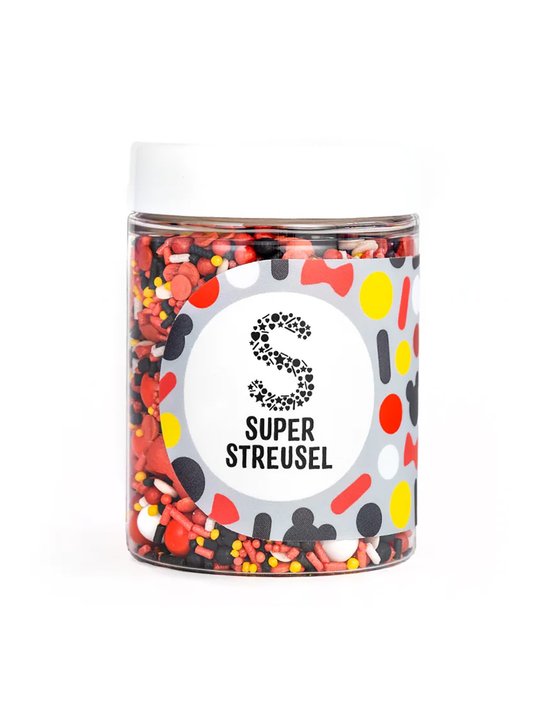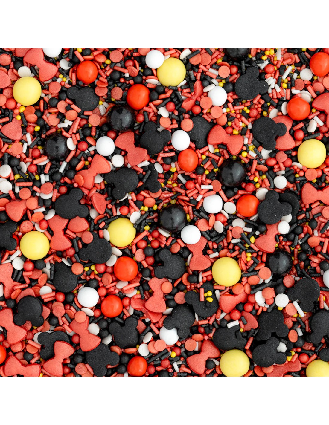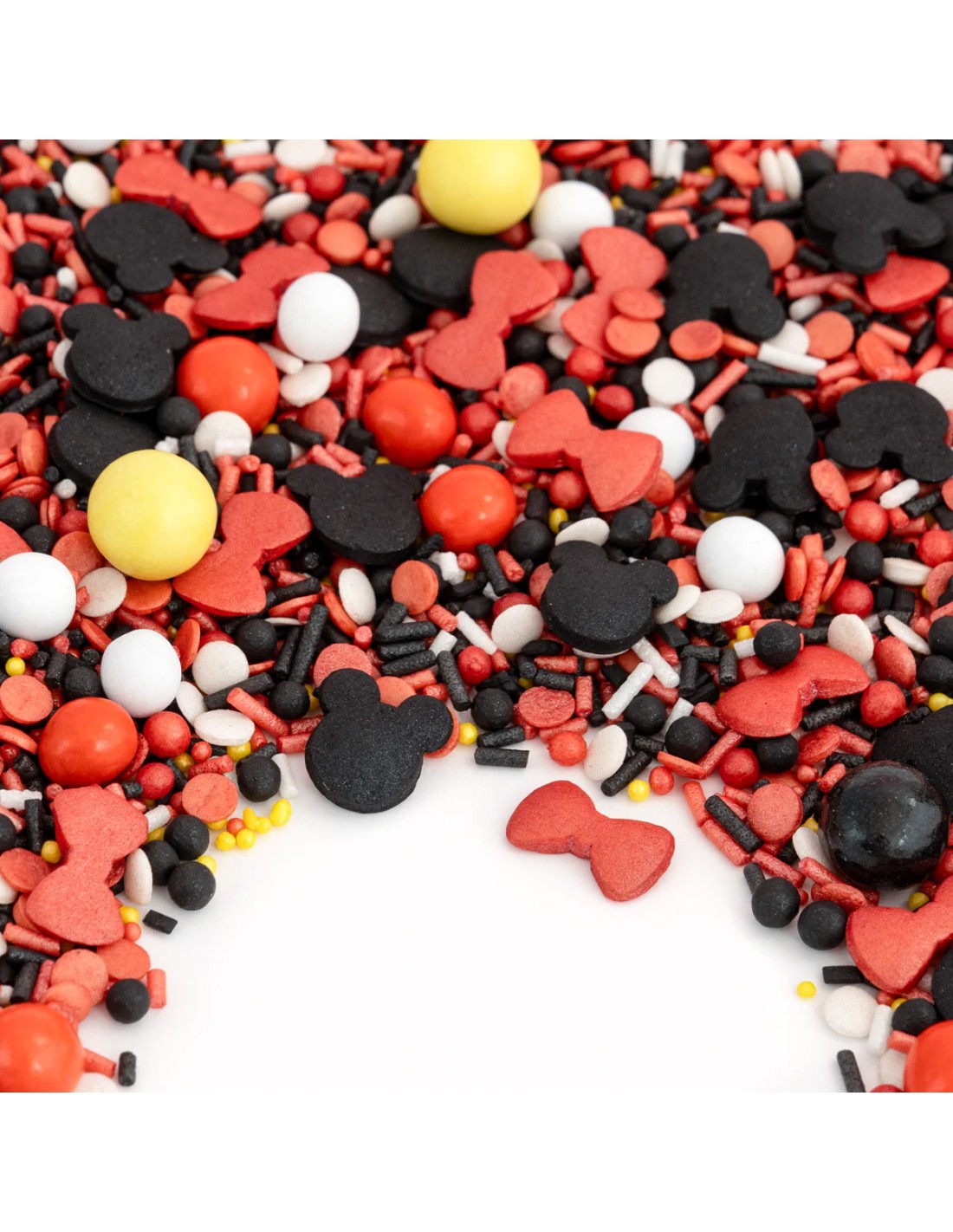 Dit zit erin: zwarte muizenkoppen met iconische oren, rode strikjes voor de schattigste look ooit, glimmende chocoladeballetjes in zwart en vrolijk geel, knapperige mini crunchy balletjes in wit en rood, en natuurlijk een wilde sprinklemix van confetti sprinkles in rood, wit en zwart.
