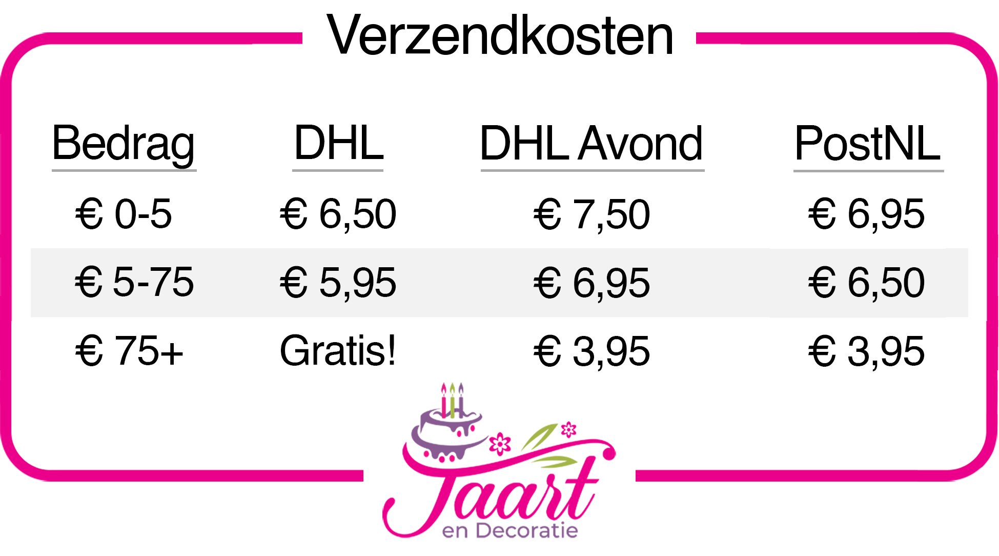 - Taart en Decoratie kiest vervoerder & Verzendwijze (standaard verzendwijze): Taart en Decoratie kiest een passende vervoerder, dit kan DHL of PostNL zijn, u kunt geen voorkeur geven. Indien u de bestelling plaatst op werkdagen voor 15.30 uur verzenden wij uw bestelling dezelfde werkdag. U kunt het (brievenbus)pakket vanaf de volgende werkdag verwachten. Bezorging maandag tot en met zaterdag. Vanaf € 75,- is deze optie gratis. De levertijd is 95% accuraat en geen garantie. Taart en Decoratie kiest een passende verzendverpakking.