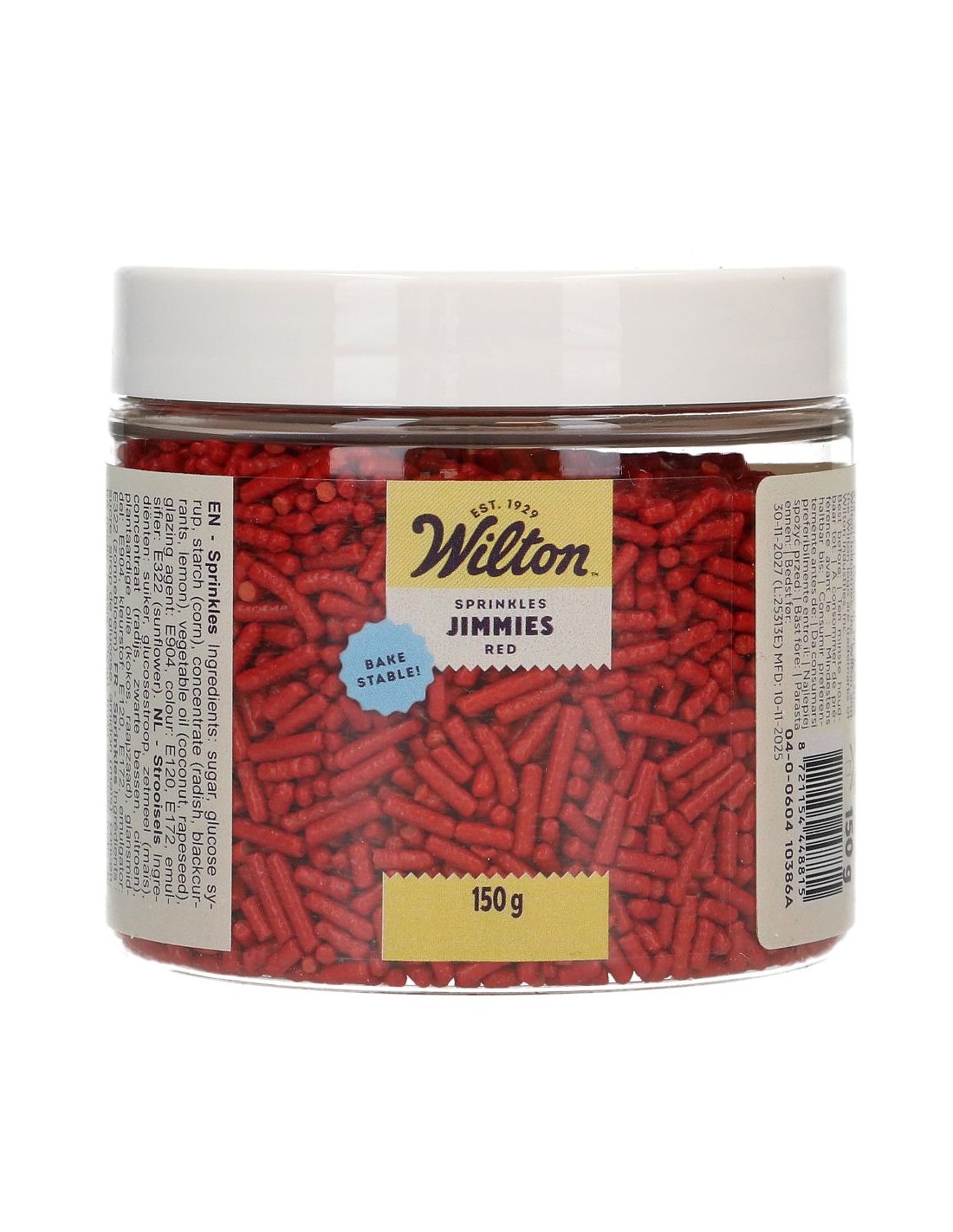 Voeg lekker wat kleur toe aan elke hap met de Wilton Jimmies! Deze sprinkles zijn speciaal ontwikkeld om hun levendige kleuren tijdens het bakken te behouden. Ze kunnen worden gemengd door koekjesdeeg, cupcakebeslag of lichte cakes, zodat je lekkernijen er van binnen net zo leuk uitzien als van buiten. Een essentieel ingrediënt voor elke verjaardagstaart, regenboogtaart of andere themataart! Kies de kleur die bij je thema past en creëer eenvouding een verrassingseffect bij het aansnijden van de taart. Verkrijgbaar in meerdere kleuren en een regenboogmix.
