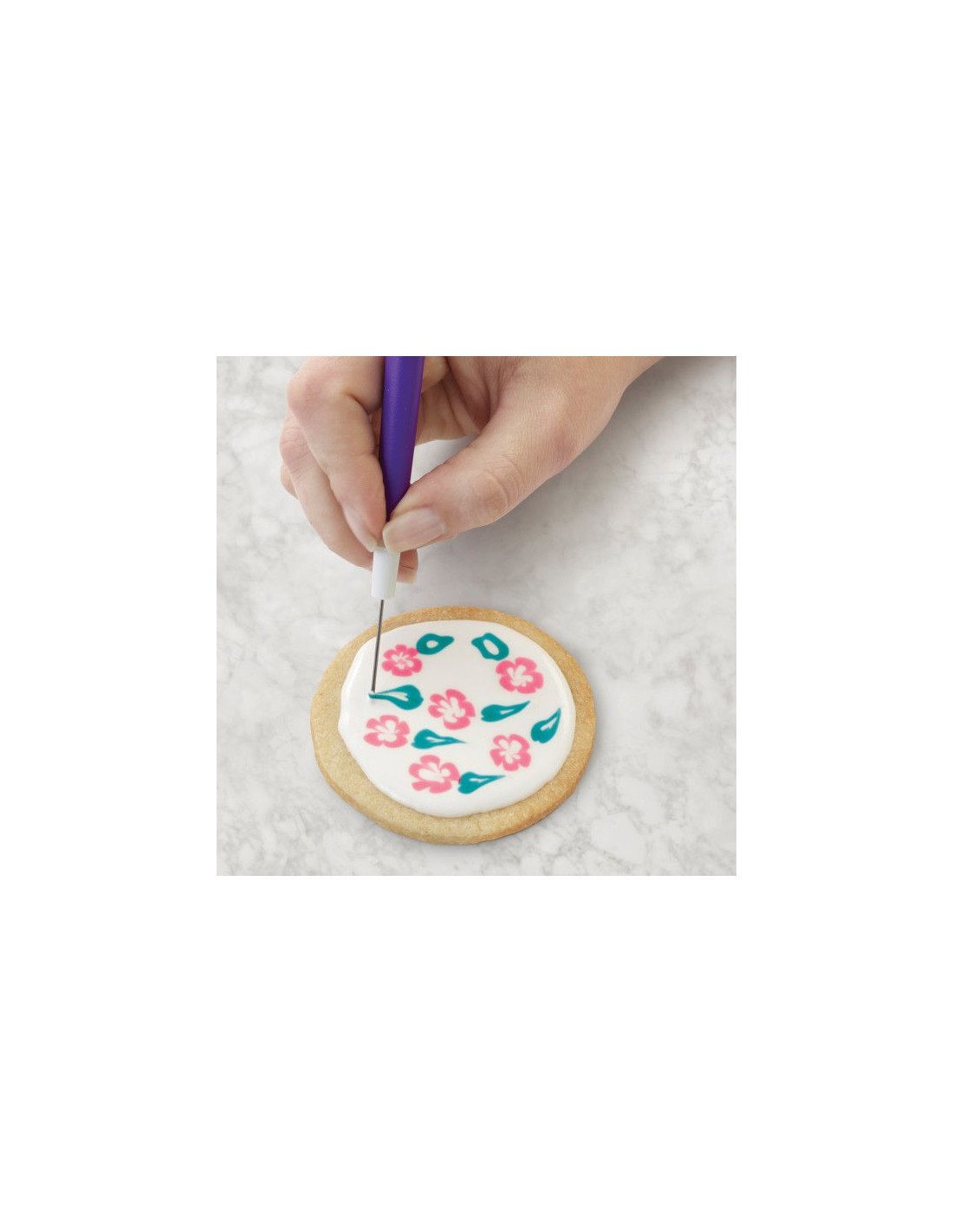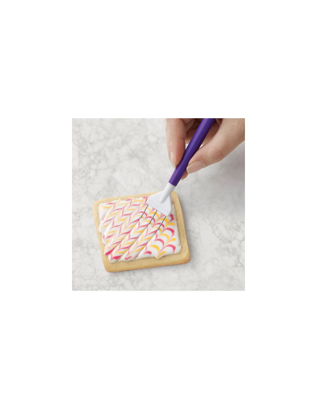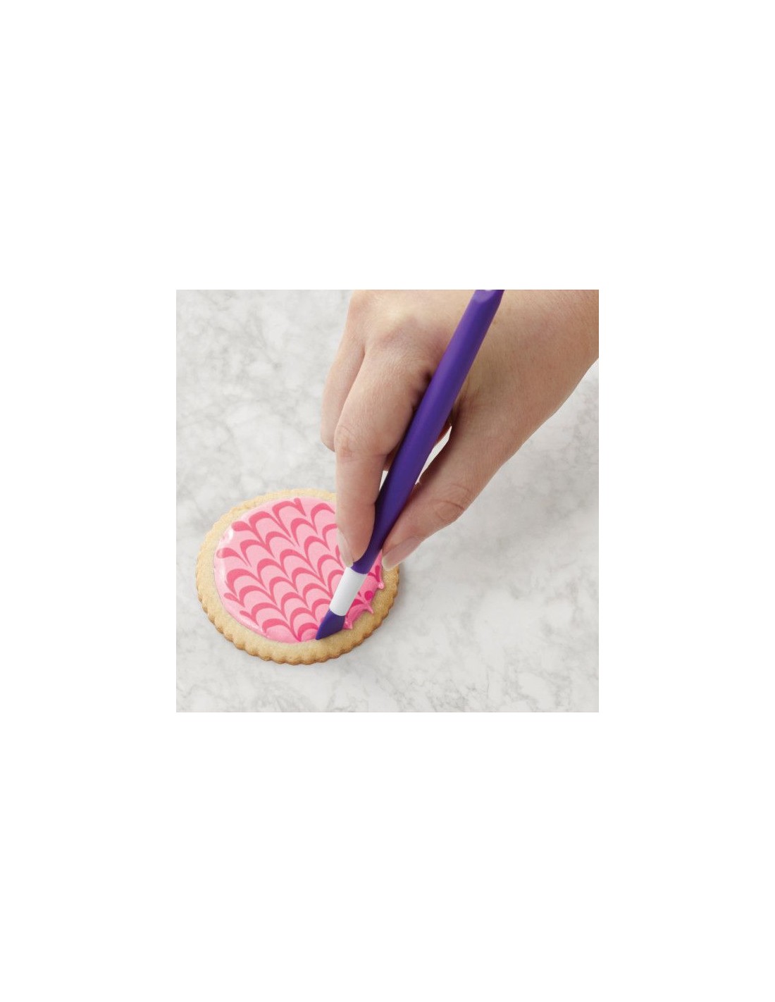 Deze set bestaat uit een siliconen schraper voor het oplossen van foutjes, een kamvormig gereedschap met 3 puntjes voor het netjes en gelijkmatig trekken van strepen icing en een scribe tool voor het slepen en marmeren. De dop kan gebruikt worden voor slepen van een bredere kleuren (zoals bijvoorbeeld houndstooth).