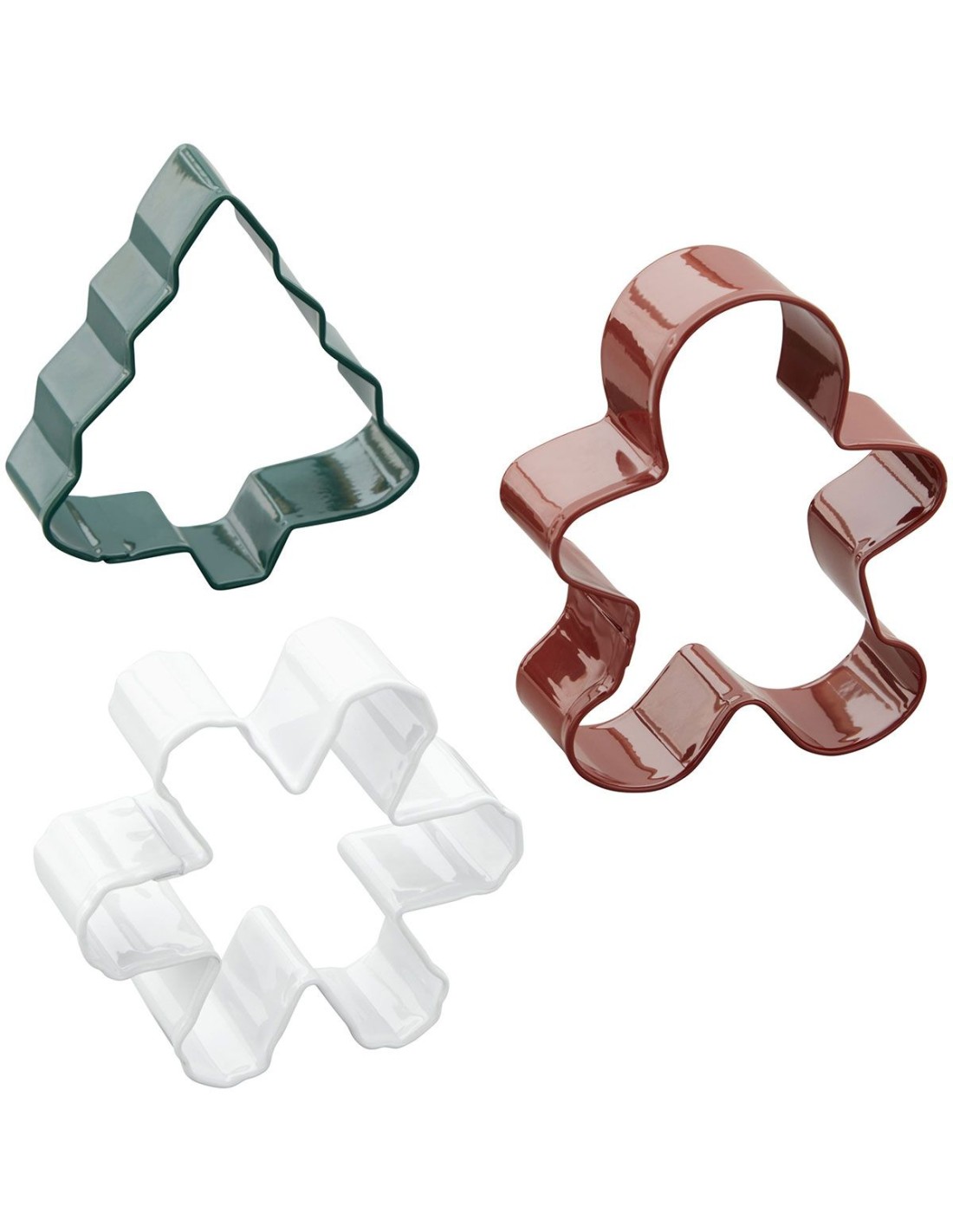 Metalen uitsteker set van Wilton met vrolijke kleurcoatings in kerst thema. Set bestaat uit een sneeuwvlok, 'gingerbread boy' en kerstboom.Afmeting ongeveer 6 tot 9 cm doorsnede.